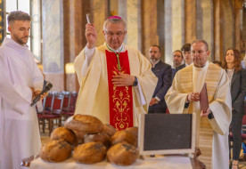 április 20. | 16:53Veres András megáldotta a Káldi-biblia kiadásának 400. évfordulójára készült „próféta kenyerét”Négyszáz évvel ezelőtt jelent meg az első teljes magyar nyelvű katolikus biblia, melyet 1605-ben kezdett el fordítani a latin Vulgata alapján Káldi György jezsuita szerzetes. A jubileumi évfordulóhoz kapcsolódóan április 19-én a győri Nagyboldogasszony-templomban bemutatott szentmise után... »
