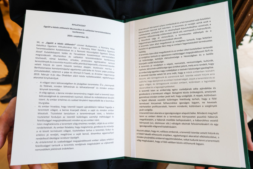 Mi, az Együtt a közös otthonért címmel Budapesten, a Pázmány Péter Katolikus Egyetem Hittudományi Kara, a Pázmány Péter Katolikus Egyetem Teremtésvédelmi Kutatóintézete és a Nemzeti Közszolgálati Egyetem Eötvös József Kutatóközpont Vallás és Társadalom Kutatóintézete szervezésében megrendezett ökumenikus és vallásközi teremtésvédelmi konferencia résztvevői, római katolikus, ortodox, protestáns egyházakhoz tartozó keresztények és a szunnita muszlim vallás jelen lévő képviselői a teremtő Istenbe vetett hitünk és szent írásaink tanítása alapján, ösztönzést merítve I. Bartholomaiosz konstantinápolyi egyetemes pátriárka és Ferenc pápa prófétai útmutatásából, valamint a pápa és Ahmad et-Tajjeb, az Al-Azhar nagyimámja 2019. február 4-én Abu-Dzabiban aláírt közös nyilatkozatából, egybehangzó akarattal kinyilvánítjuk: