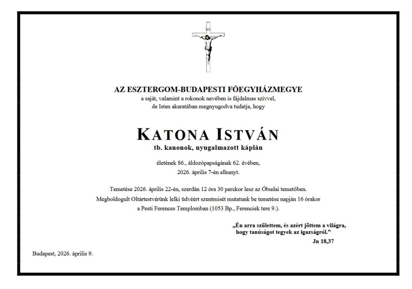 Temetése április 22-én, szerdán 12 óra 30 perckor lesz az Óbudai temetőben; lelki üdvéért az engesztelő gyászmisét ugyanezen a napon mutatják be a pesti ferences templomban, 16 órakor.