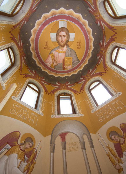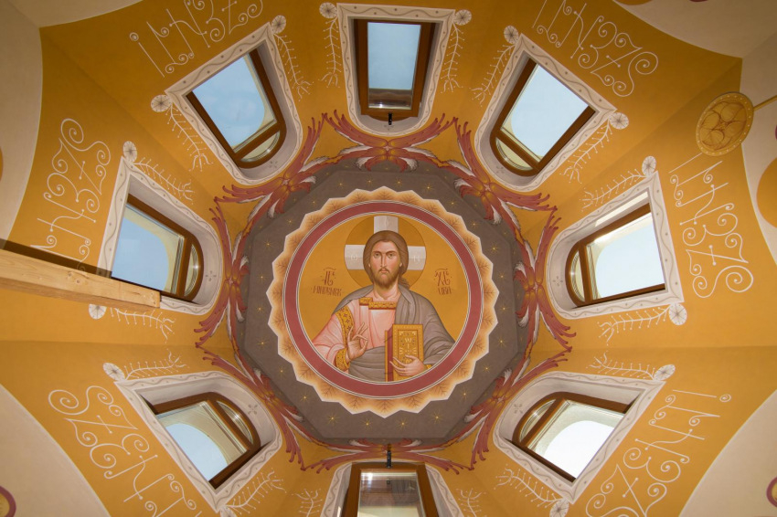 A kápolnabelső festési munkálatainak egyik fontos állomásához érkeztek a művészek, Makláry Zsolt és Makláry Teréz: teljesen elkészült a kupola Pantokrátor-falképe.