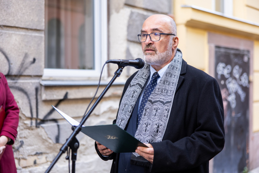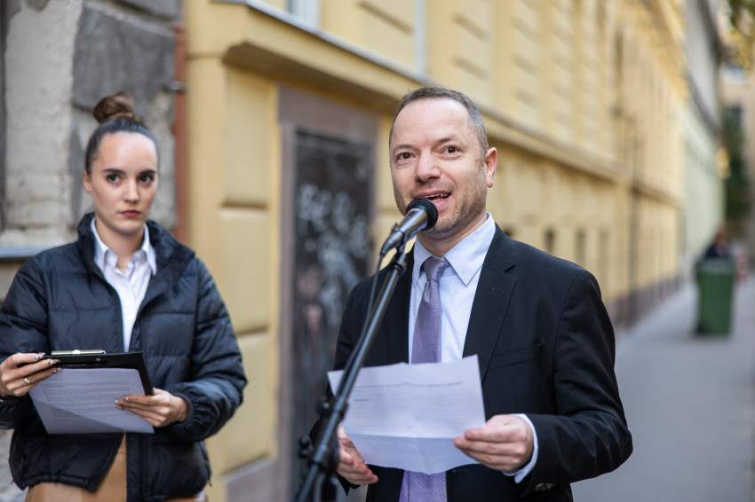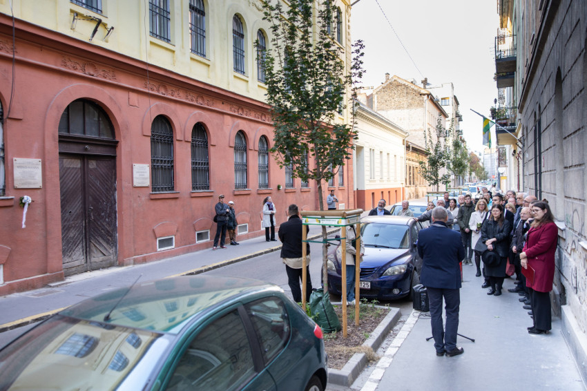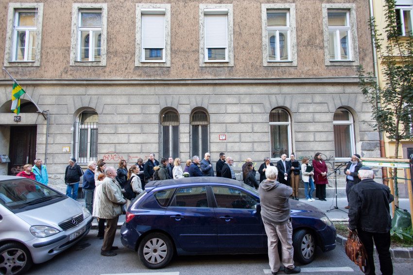 Végül felhívta a jelenlévők figyelmét egy hiányzó emléktábla nyomaira is: „Ezen a homlokzaton sokáig egy antifasiszta emléktábla állt. Nem találtunk még képet se róla, mert valamilyen aggályos szövegrész miatt a rendszerváltozás körül eltávolították. Nagyon örülök, hogy megfelelő szövegezéssel most ezt a hiányt is pótolhattuk.