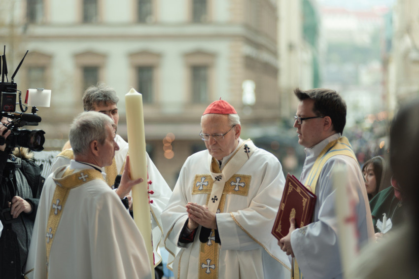 A húsvét vigíliájának szertartása a feltámadási körmenettel zárult: Erdő Péter bíboros vezetésével a hívők a bazilika falai körül hirdették a feltámadás örömét.