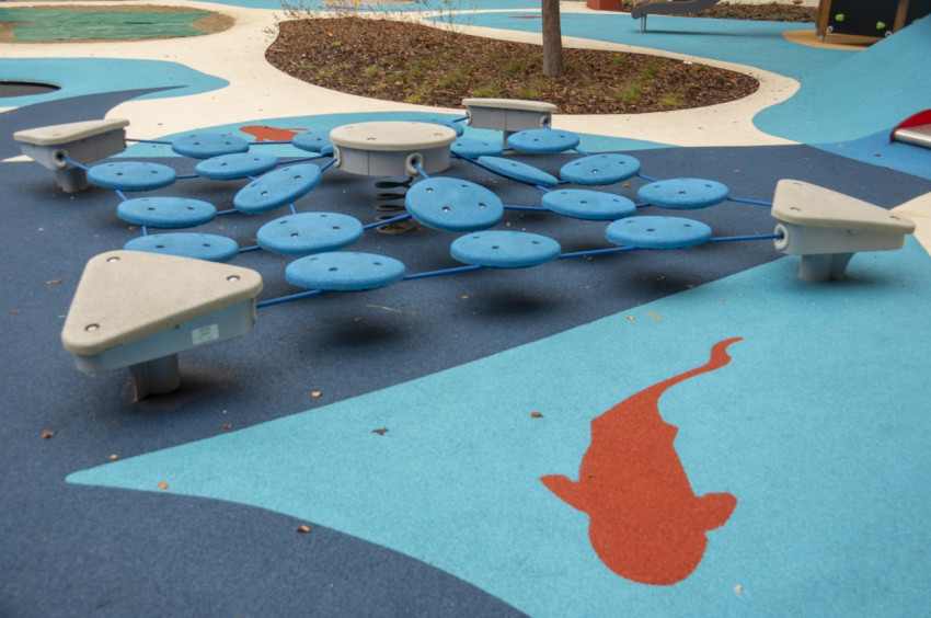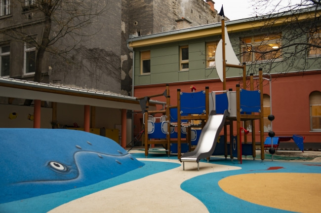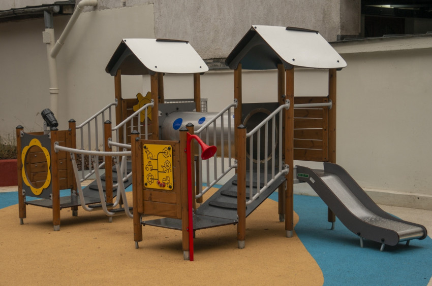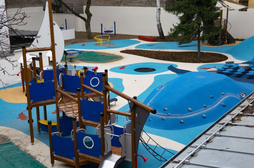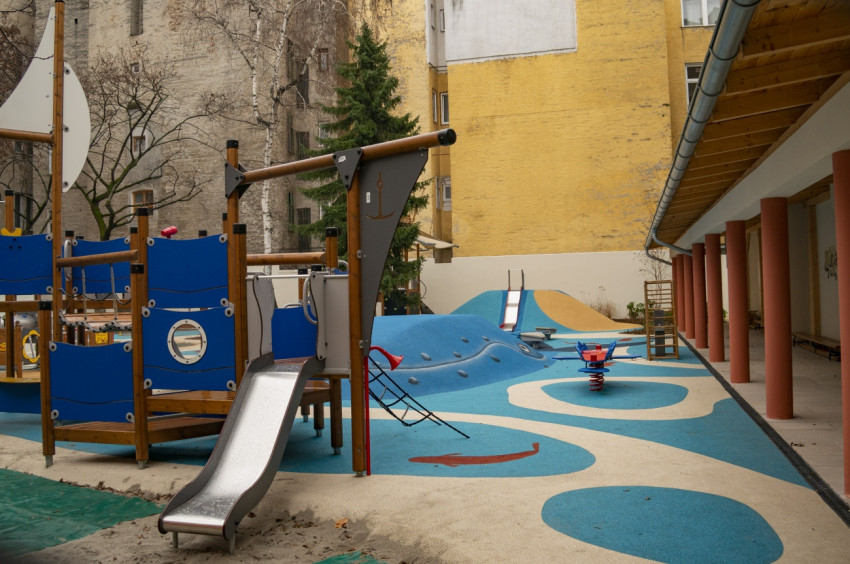Az udvar kialakításánál, integrált intézmény lévén, szintén fontos szempont volt az akadálymentesség. A gyerekeket zöld növényzet és újonnan telepített játszóeszközök várják. Biztonságuk érdekében az udvar színes esésvédő burkolatot kapott, a nyári hőséget pedig párakapu és ivókút enyhíti majd.