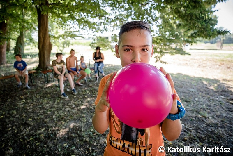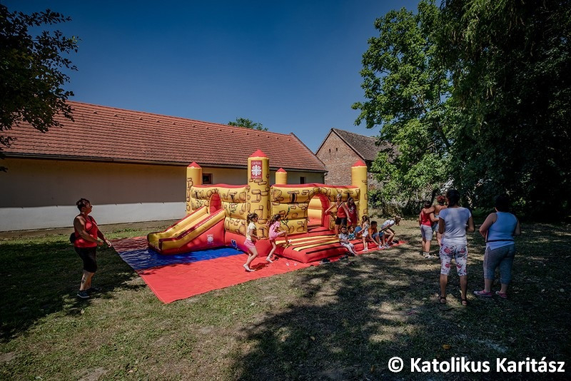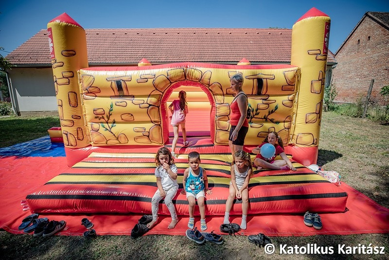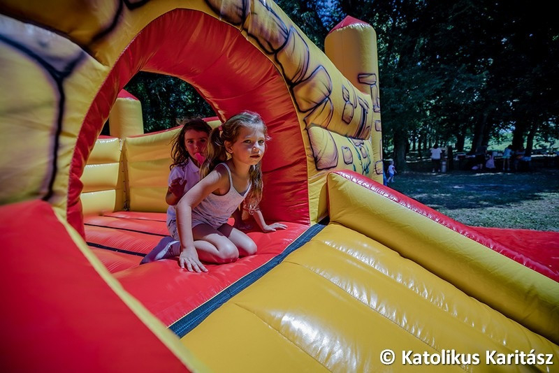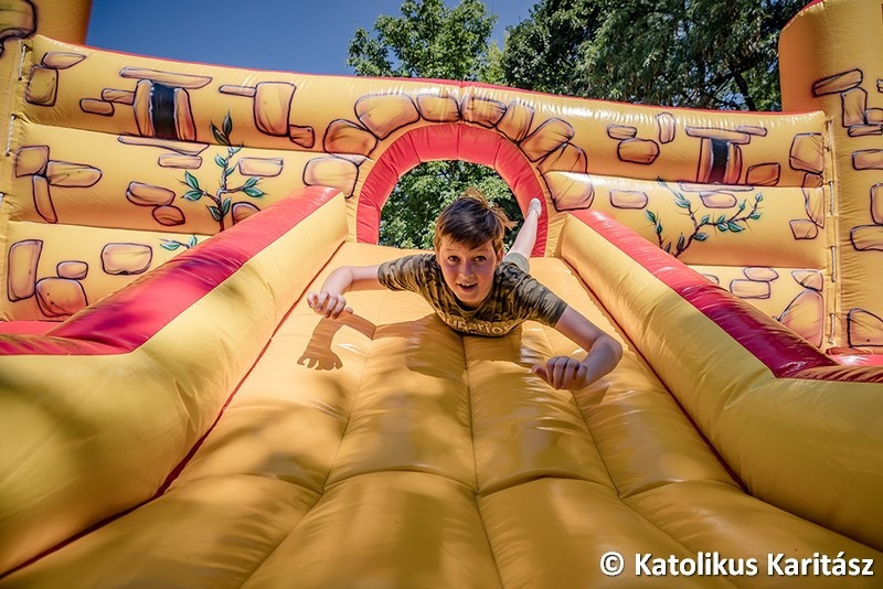A mostani foglalkozás az ifi- és gyermekprogramok sorába csatlakozik – tudjuk meg Kovács Tibortól, a Karitász munkatársától, aki bemutatja nekünk az eseményt. Középpontban a már említett légvár áll, amin korcsoportok szerint lehet csúszkálni, ugrálni. Kora délutánra már nagyon felmelegszik a vár, így azt le szokták engedni, de mára már ez is a „műsor része”, közösen eresztik le és csomagolják el a gyerekekkel a játszóvárat. Ezután körversenyek következnek, majd egy hűsítő vizesluficsata.