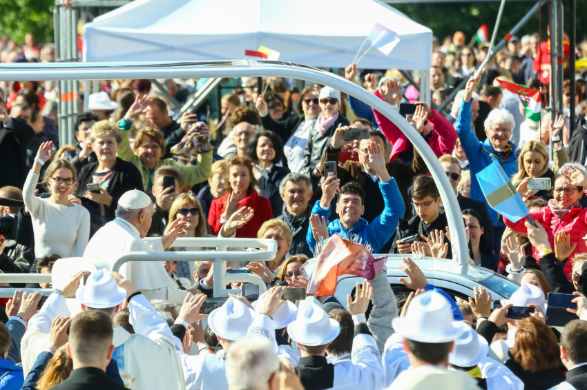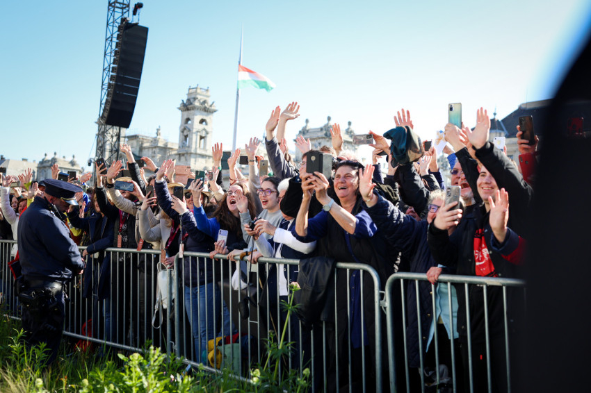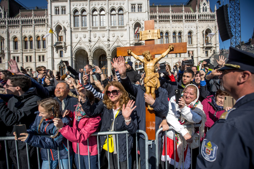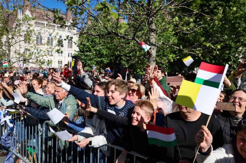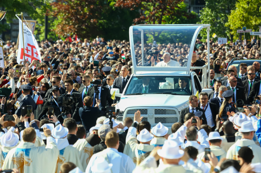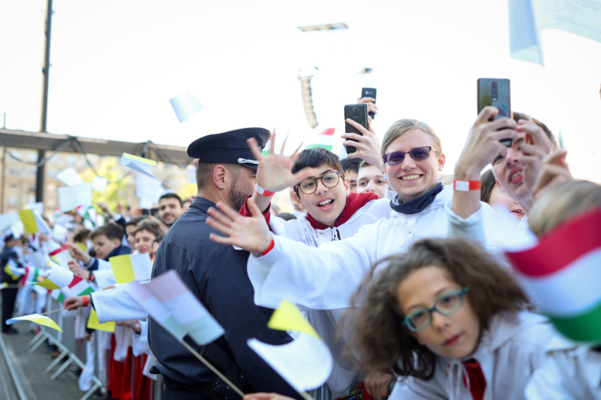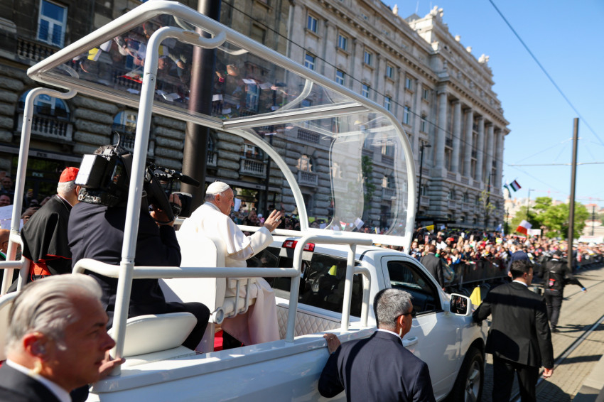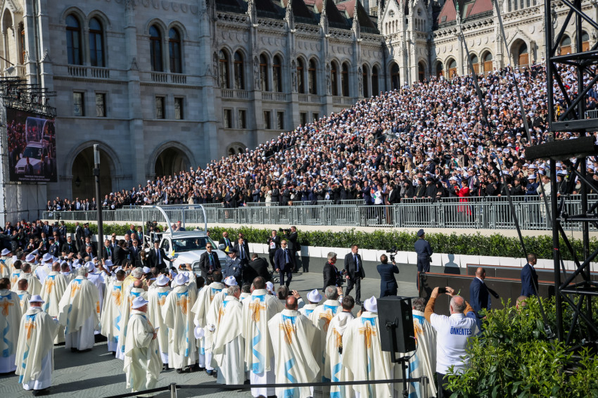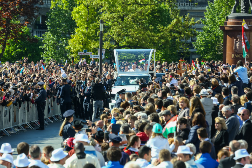 A Szentatya 8.56-kor érkezett meg a Kossuth térre, ahol magyar és vatikáni zászlókat lengető lelkes tömeg fogadta. Ferenc pápát a pápamobilon Erdő Péter bíboros, prímás kísérte. A pápa közel fél órán keresztül, hosszasan elidőzött a tömegben.