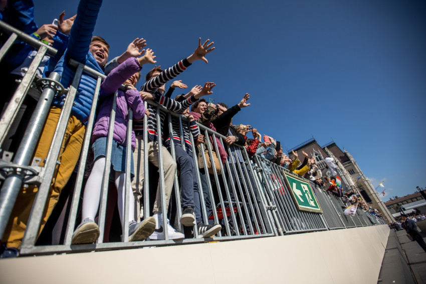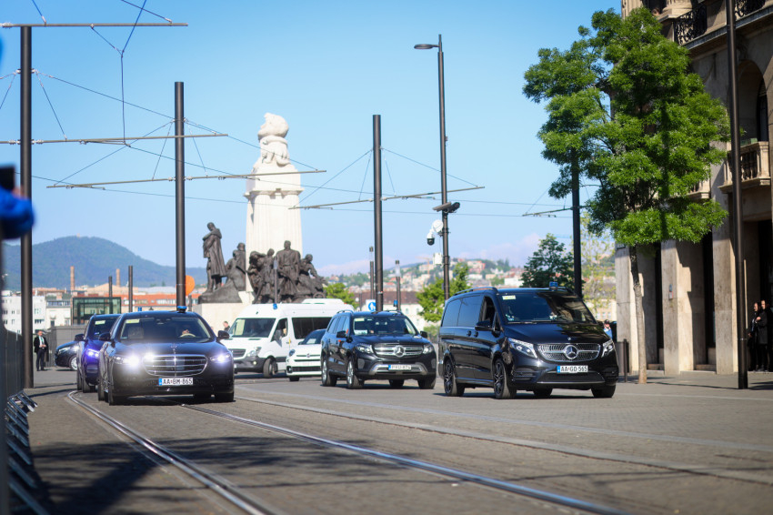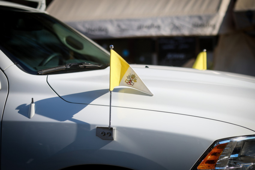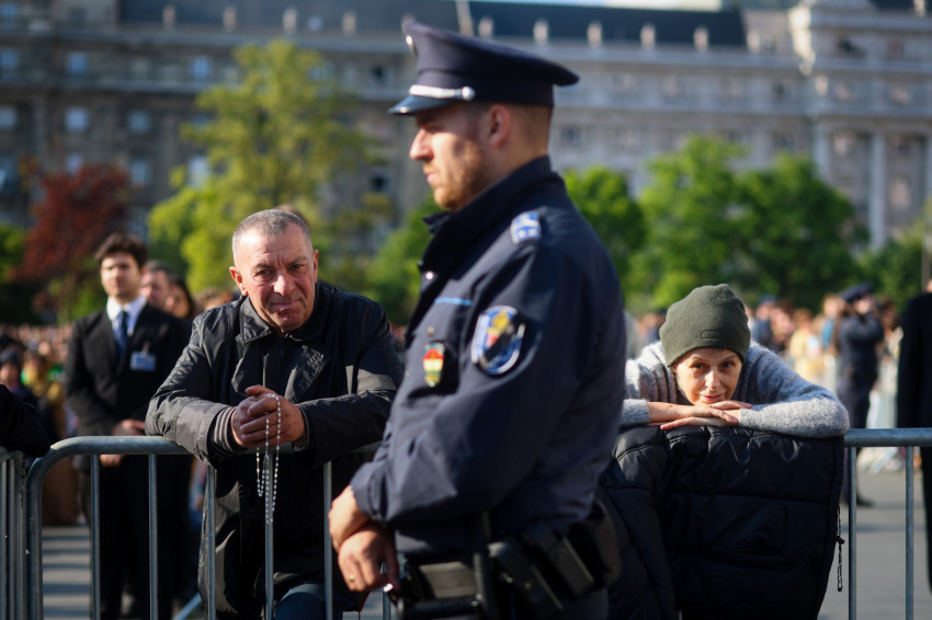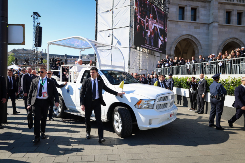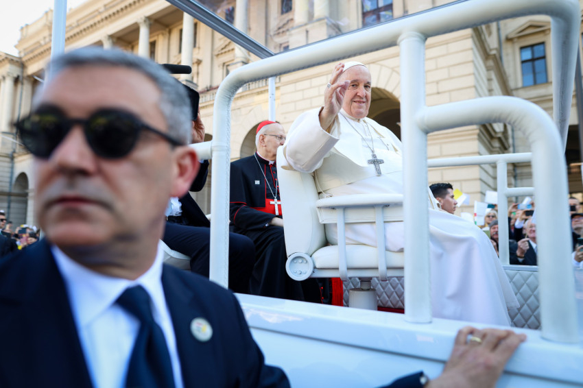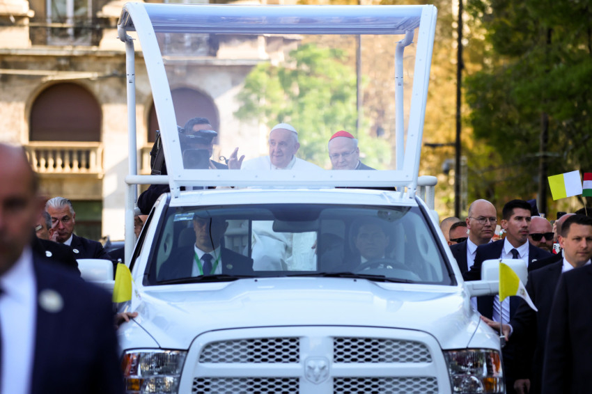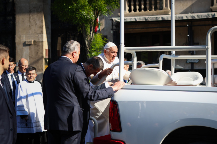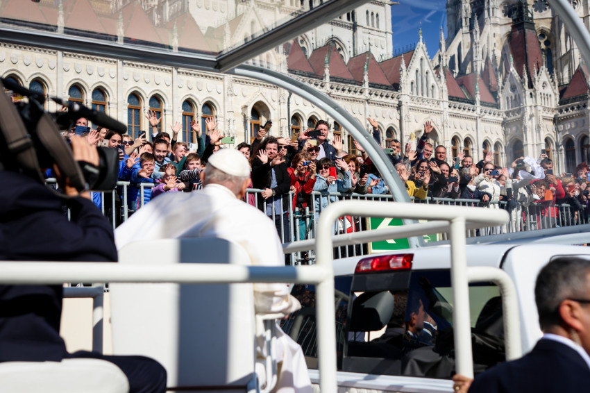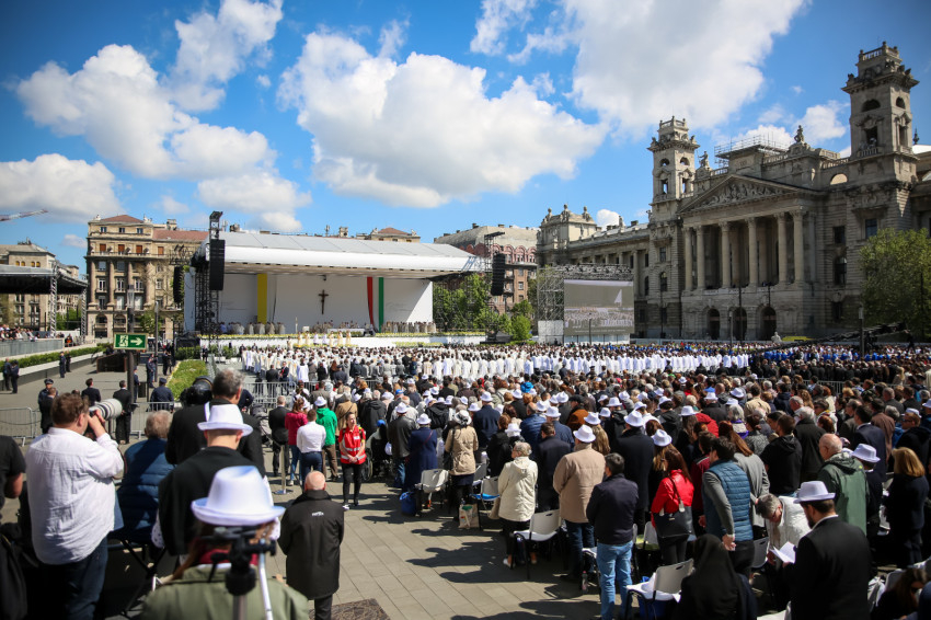 A Szentatya 8.56-kor érkezett meg a Kossuth térre, ahol magyar és vatikáni zászlókat lengető lelkes tömeg fogadta. Ferenc pápát a pápamobilon Erdő Péter bíboros, prímás kísérte. A pápa közel fél órán keresztül, hosszasan elidőzött a tömegben.