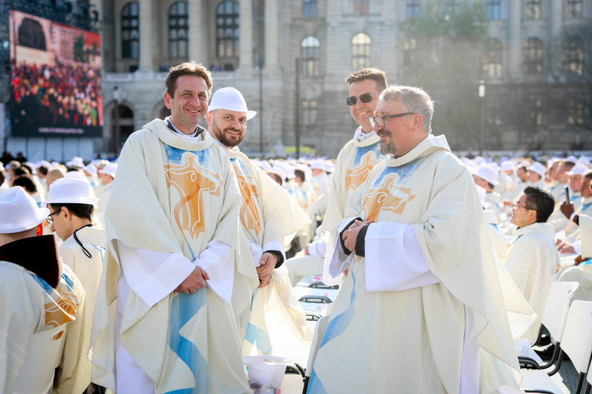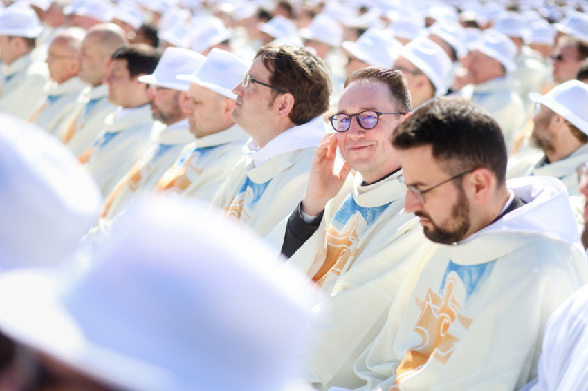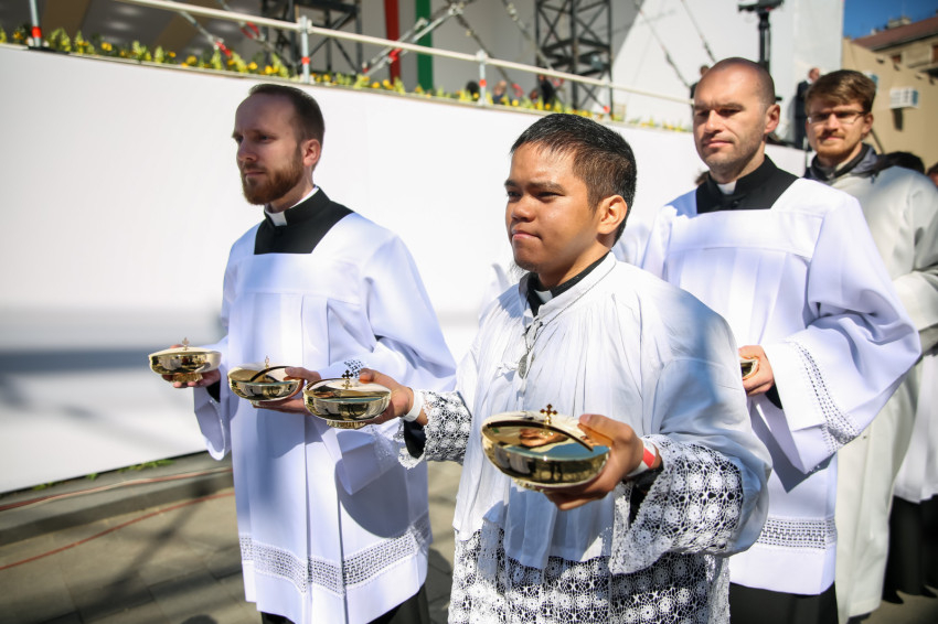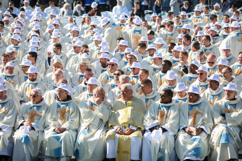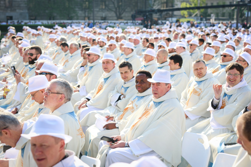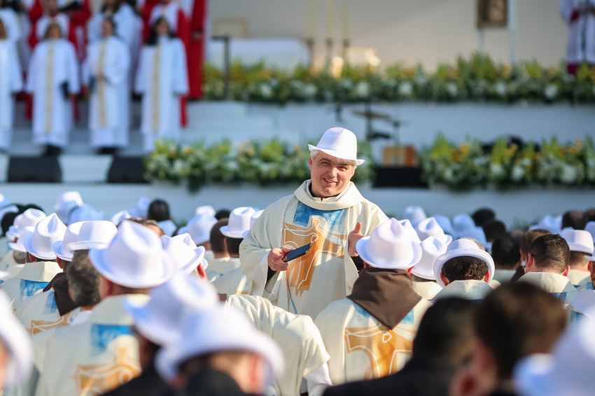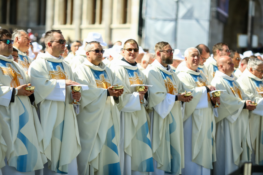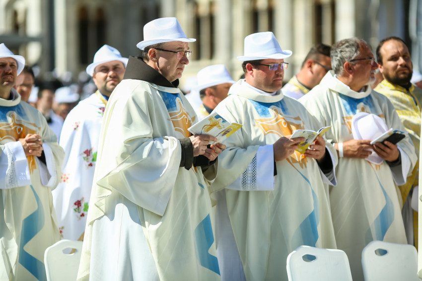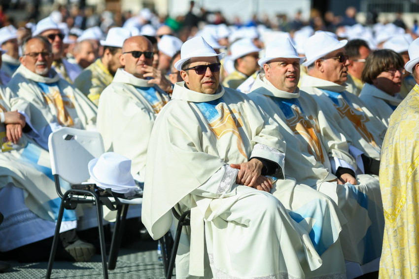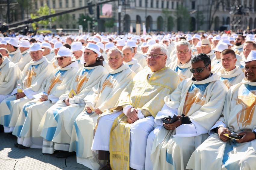 Testvérek, ahogy ma reggel itt vagyunk, érezzük meg annak örömét, hogy Isten szent népe vagyunk: mindannyian az ő meghívásából születünk; ő gyűjtött egybe minket, és ezért vagyunk az ő népe, az ő nyája, az ő Egyháza. Azért hívott itt egybe minket, különbözzünk bár egymástól és tartozzunk bár különböző közösségekhez, hogy szeretetének nagysága mégis egyetlen ölelésben egyesítsen minket. Olyan szép, ahogy most együtt vagyunk: püspökök és papok, szerzetesek és világi hívők; olyan jó, hogy ezt az örömöt más keresztény felekezetek küldötteivel, a zsidó közösség vezetőivel, a civil szervezetek képviselőivel és a diplomáciai testülettel is megoszthatjuk. Ez a katolicitás: mindannyiunkat, akiket a Jó Pásztor név szerint szólított meg, arra hívott, hogy szeretetét befogadjuk és továbbadjuk, hogy az ő nyáját befogadóvá tegyük és sohasem kirekesztővé. És ezért mindannyian arra kaptunk meghívást, hogy ápoljuk a testvériség és az együttműködés kötelékeit, megoszlás nélkül,