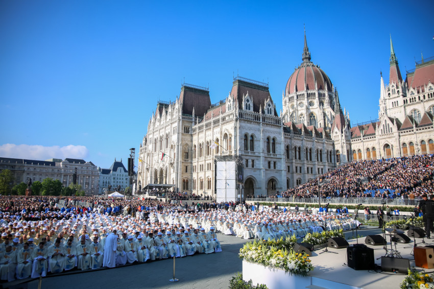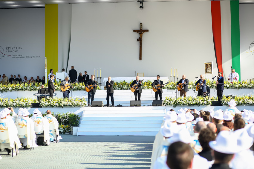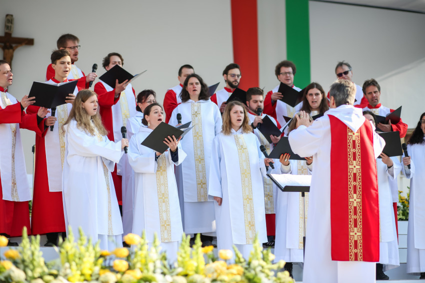A szertartáson a pápalátogatás alkalmából a székesegyházak és templomok képzett énekeseiből, valamint a Kodály Zoltán Magyar Kórusiskola egykori és mai diákjaiból álló egyesített kórus szolgált. A meghívott kórustagok – összesen 312 fő – Budapest, Esztergom, Eger, Győr, Vác, Székesfehérvár, Pécs, Szeged, Kaposvár, Kóka, Nagykanizsa, Borsosberény, Szarvaskő, Fót, Sukoró, Sárszentmihály, Mór, Jászberény, Ősi, Bátya, Kalocsa, Vámosszabadi, Nyúl, Bogács, Kerepes, Kistarcsa, Makó, Veszprém, Ajka, Zirc, Balatonalmádi, Várpalota, Nagykőrös, Keszthely, Gödöllő, Veresegyház, Nyíregyháza, Tura, Tiszaföldvár, Őrbottyán, Kerepes, Rétság, Győrzámoly, Csobánka, Göd, Zalacsány és Kistarcsa egyházi énekkarait képviselték. Az egyházmegyék kórusát Varga László, a váci székesegyház karnagya, a Magyar Katolikus Püspöki Konferencia zenei testülete, az Országos Magyar Cecília Egyesület (OMCE) központi igazgatója szervezte. Több karnagy is vezényelt, Varga László mellett Czifra János, Ménesi Gergely, Sapszon Borbála, Sapszon Ferenc és Szili Zoltán.