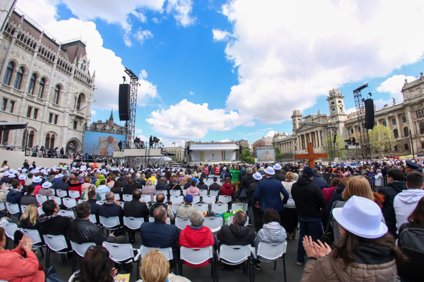 A Kossuth teret 6 óra körül nyitották meg a résztvevők előtt, és nagyon hamar be is népesült. A felvezető program 7 órakor vette kezdetét. Először a Szentatyáról és a pápalátogatásról szóló videókat, valamint a pápalátogatás hivatalos dala, a Camino, valamint a szintén a pápalátogatásra készült Magyar Fohász 2023 című dal klipjét játszották le. Ezután rózsafüzért imádkoztak, az ország különböző részeiről érkezett előimádkozók vezetésével.