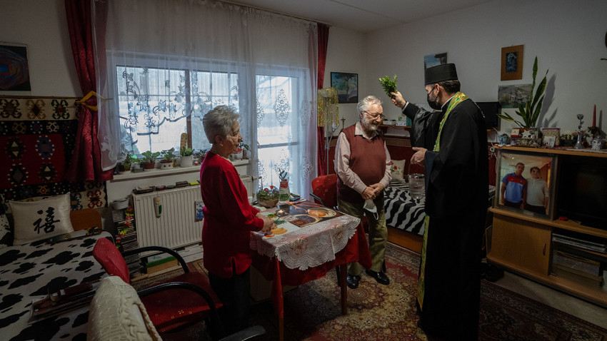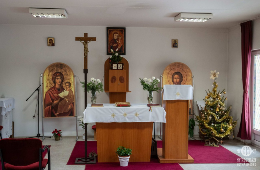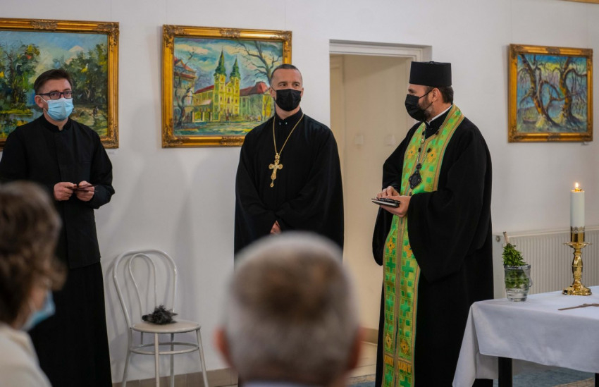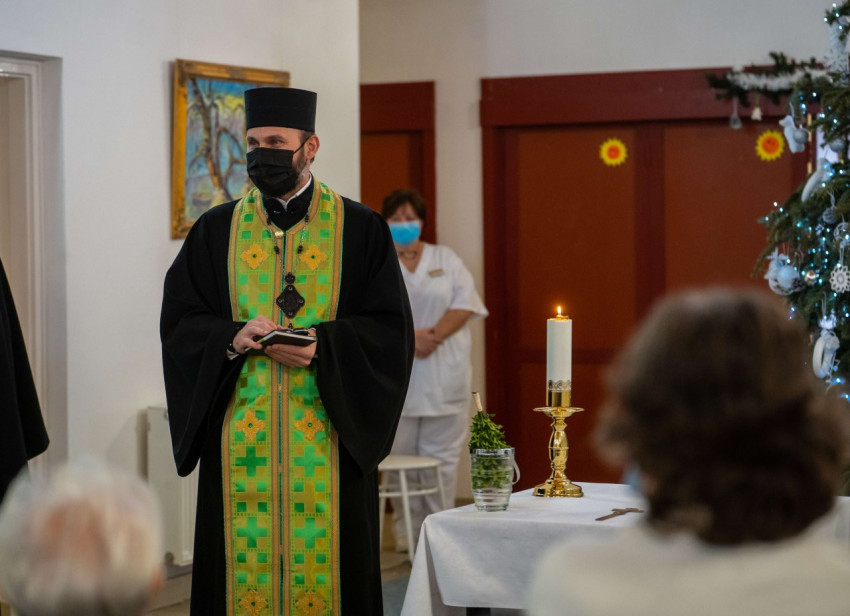 A vízkereszti tropárt és kontákot énekelve kísérte a püspököt Kerezsi Józsefné intézményvezető, Trella Tibor lelki igazgató, Papp Tibor főhelynök, valamint Bodnár-Szabó Ildikó, az egyházmegye szociális irodájának vezetője.