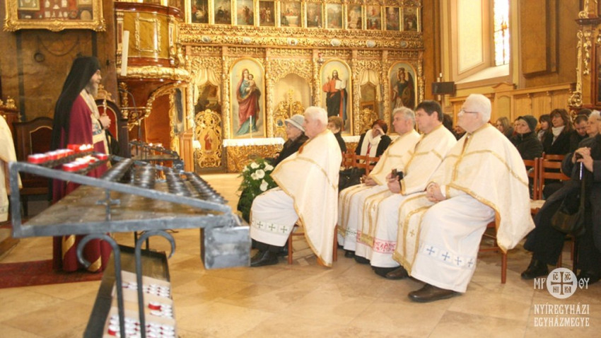 A püspök idézte a 128. zsoltárt: „»Feleséged, mint a termékeny szőlőtő házad falai között, fiaid, mint az olajfa sarjadékai asztalod körül, íme, így áldatik meg az ember, ki az Urat féli…« Ilyen istenfélő szülőket köszöntünk – mondta a főpásztor –, akiket szemlátomást így áldott meg az Úr. Megáldotta Nyírturán az első gyermekekkel, és Pátyodon is, ahol olykor még nehezebb munkával sikerült csak megkeresni a mindennapi betevőt. A Jóisten áldása volt a családon. A fiak a szülők segítségére lehettek, amikor Nyírgyulajban, a máriapócsi kegykép közelében a család kiteljesedett, így élvezhették a békességet újra meg újra. Itt, Máriapócson, az Istenszülő Szűzanya kegyképének a tövében örömmel gyűlik most össze a család, hiszen az elmúlt évtizedeknek is itt volt a fókuszpontja, a gondok, bajok és az örömök között. Mert az Istenszülő nem szűnt meg közbenjárni egyszülött Fiánál ezért a nagy családért” – tette hozzá Orosz Atanáz.