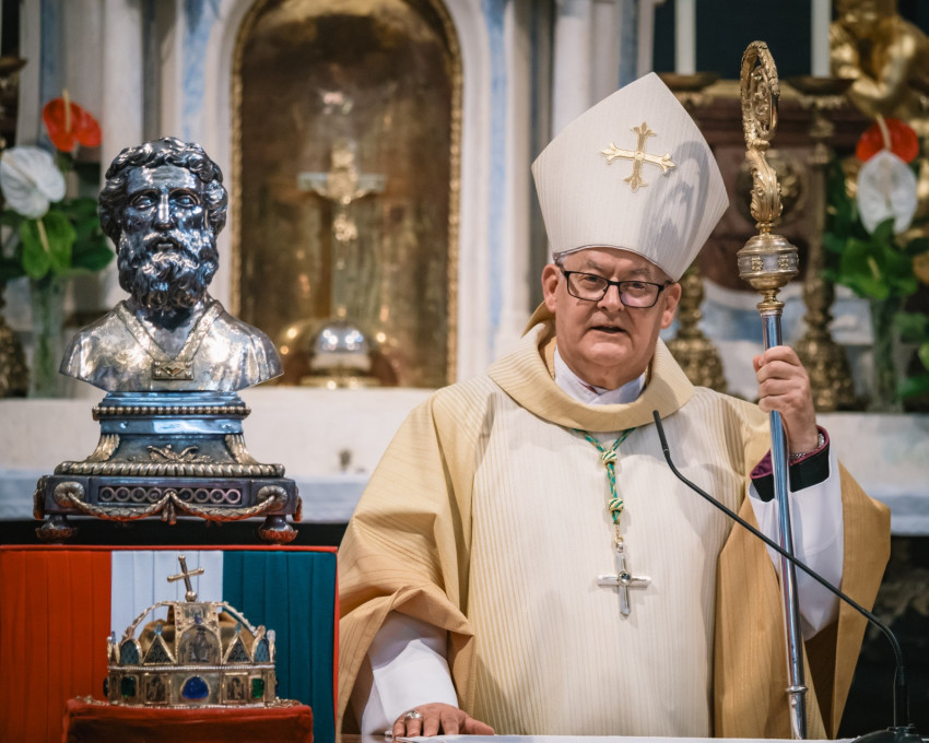 „Itt állunk augusztus 20-án Szent István királyra emelve tekintetünket, hiszen 1083-ban itt, Fehérváron avatták őt szentté. Nézzük a Mária Teréziától nekünk készíttetett, bécsi mestertől kiváló módon megalkotott ereklyetartót, amelyet őrzünk, mert nagyon értékes számunkra. Főleg azért, mert a benne lévő ereklye érték nekünk. Szent István koponyájának a darabja, amelyet ezer éve őrzünk, az ő eleven jelenlétét idézi mindannyiunknak” – kezdte ünnepi beszédét a főpásztor.