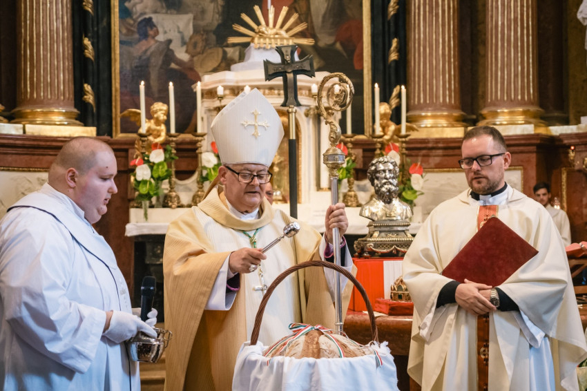 A Pécsi Egyházmegye főtemplomában Felföldi László pécsi megyéspüspök celebrált szentmisét államalapító szent királyunk ünnepén, ahol az oltár előtt helyezték el a szentmisét megelőző városi ünnepségen megáldott és megszegett kenyeret.