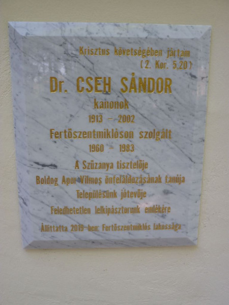 Cseh Sándor tiszteletére két éve, 2019 májusában helyeztek el emléktáblát a szeredi kápolna falán. Azóta minden májusban szentmise keretében emlékezik meg Fertőszentmiklós hívőközössége egykori kanonokjáról, Apor Vilmos titkáráról, aki 1960-ban került Fertőszentmiklósra. Nyitott szívvel és lélekkel fordult hívei felé. Szót értett az egyszerű emberekkel, a gyári munkásokkal ugyanúgy, ahogy a tanítóval vagy az orvossal is.