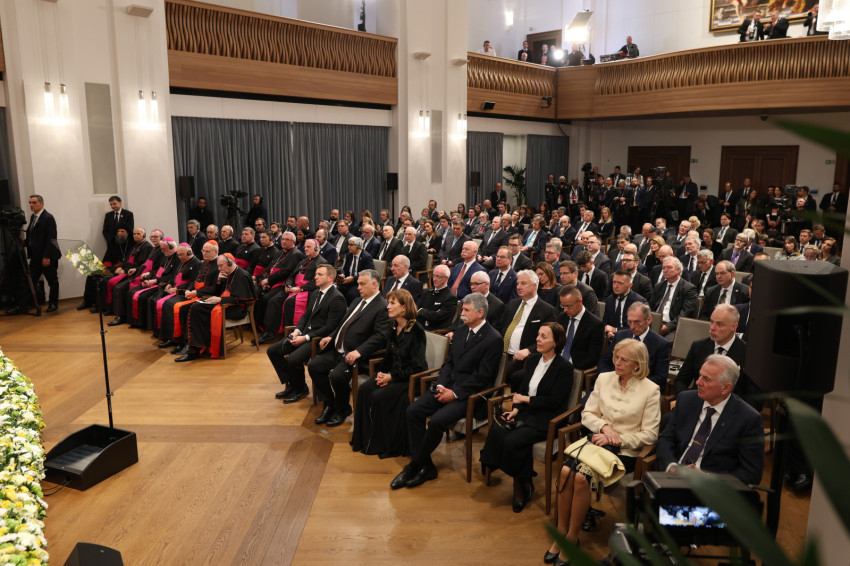 3. Ez elvezet az utolsó szemponthoz: Budapest a szentek városa – az Elnök Asszony Szent Erzsébetről beszélt –, ahogyan ezt ebben a teremben ez az új festmény is sugallja. Nem tudunk nem gondolni Szent Istvánra, Magyarország első királyára, aki akkor élt, amikor Európában a keresztények teljes közösségben éltek; szobra a budai Várban védelmezően a város fölé magasodik, a főváros szívében álló, neki szentelt bazilika pedig az esztergomi bazilikával együtt az ország legimpozánsabb egyházi épülete. A magyar történelem tehát életszentséggel fémjelezve született, és nemcsak egy király, hanem egy egész királyi család, az uralkodó, hitvese, Boldog Gizella és fia, Szent Imre szentsége által. Szent Imre intelmeket kapott atyjától, amelyek egyfajta végrendeletet jelentenek a magyar nép számára. Ma megígérték nekem, hogy kapok majd egy példányt belőle, várom is! Néhány nagyon aktuális sort találhatunk benne: „Arra kérlek, hogy mindenütt és mindenekben a szeretetre támaszkodva ne csak atyafiságodhoz és a rokonságodhoz, vagy a főemberekhez, avagy a gazdagokhoz, a szomszédhoz és az itt lakóhoz légy kegyes, hanem az idegenekhez is.” Szent Istvánt az őszinte keresztény szellem vezeti, amikor ezt írja: „A szeretet gyakorlása vezet el a legfőbb boldogsághoz”, és a gondolatot ezzel zárja: „Légy szelíd, hogy sohase harcolj az igazság ellen” (Intelmek, X). Ily módon elválaszthatatlanul összekapcsolja az igazságot és a szelídséget. Ez a hit nagy tanítása: a keresztény értékekről nem lehet mereven és bezárkózva tanúságot tenni, mert Krisztus igazsága a szelídséget és a kedvességet jelenti a Boldogságok szellemében. Innen fakad az a magyar népi jóság, amely a köznyelv bizonyos kifejezéseiben is megnyilvánul, mint például: „jónak lenni jó”, és „jobb adni, mint kapni”.