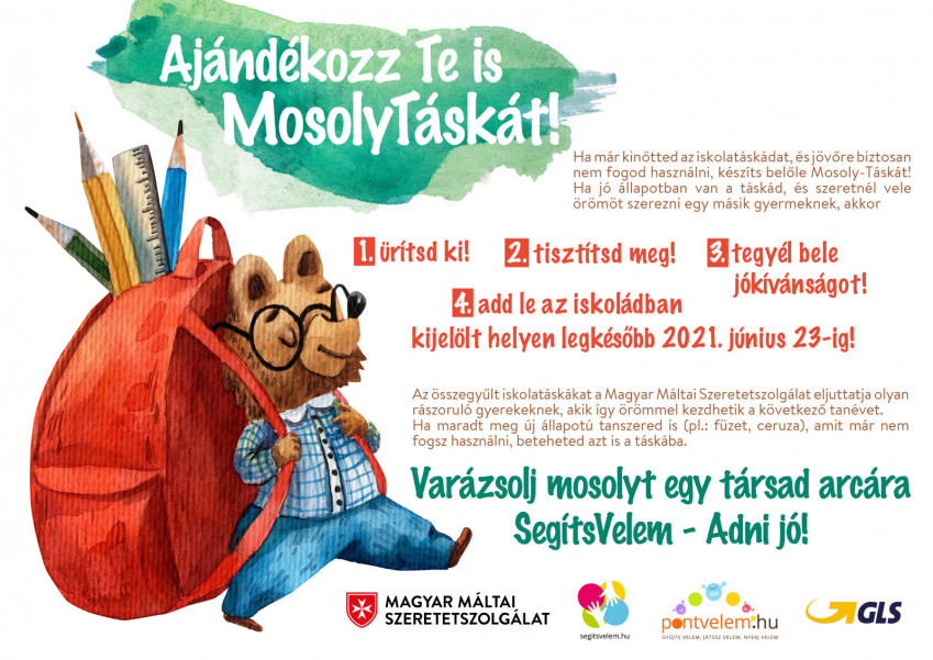 A Magyar Máltai Szeretetszolgálat, a PontVelem Okos Program és a GLS Hungary közös „MosolyTáska” akciójában általános iskolások segíthetnek nehéz helyzetben élő kortársaiknak. A tanulók június 1. és 23. között adhatják le a jó állapotú iskolatáskákat az ország minden általános iskolájában, hogy augusztusban olyan gyerekek kaphassák meg, akik családjának a táskavásárlás nehézséget jelentene.