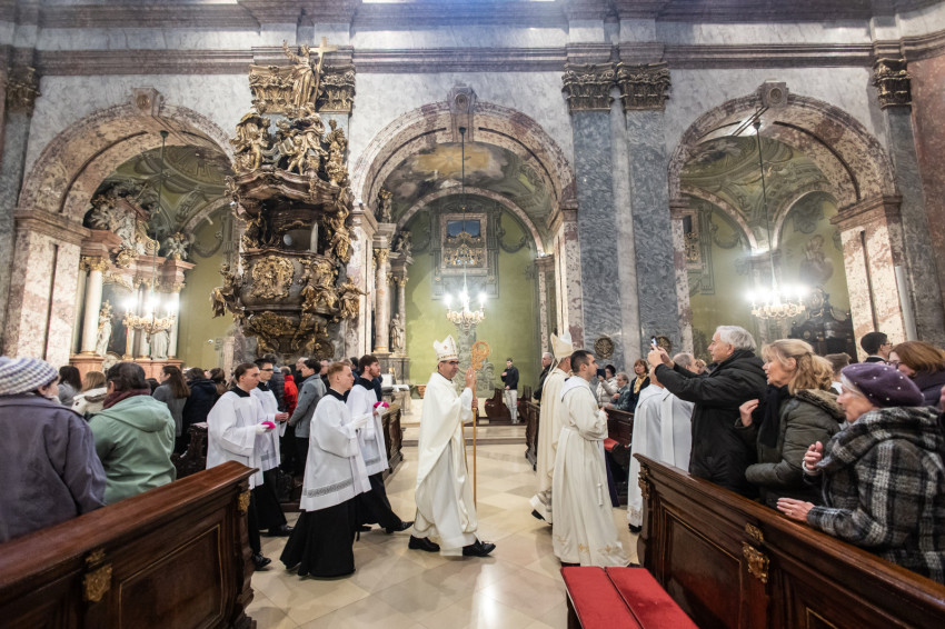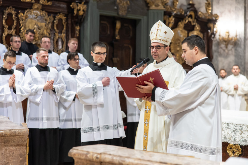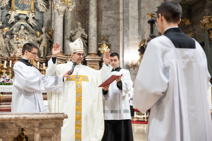 Ezt követően a püspök a felavatandó papnövendékekhez fordult: „Kedves András és Bálint, lektorok lesztek. Isten igéje van rátok bízva. Az az ige, ami nem betű, hanem lélek és élet. Szeressétek a Bibliát, legyen az számotokra mindennapi kenyér. Kedves Nándor, akolitus leszel. Ez a görög szó azt jelenti, hogy követő, aki egészen közel van Jézushoz, aki a nyomában jár. Amikor ott állsz az oltár mellett, ujjongjon a szíved: itt vagyok Jézus mellett, az ő szent testét érinthetem, adhatom. Legyél egészen egy ezzel a titokkal.”