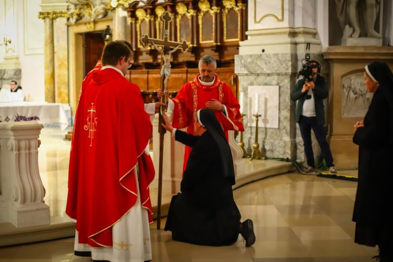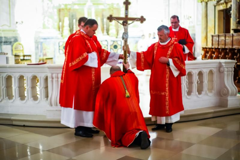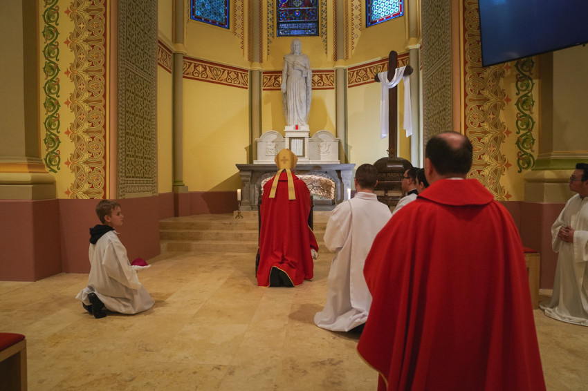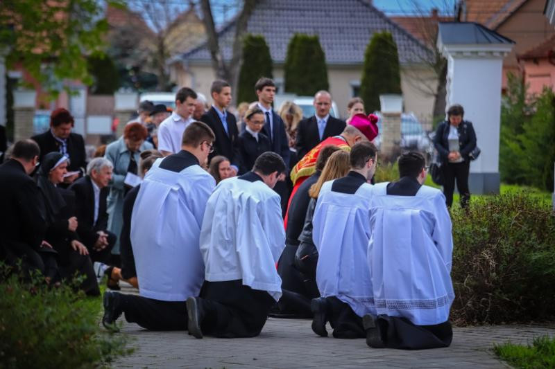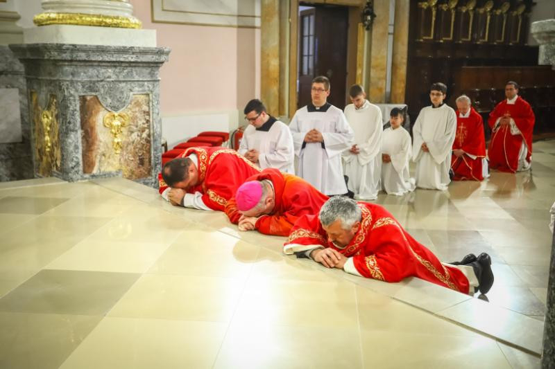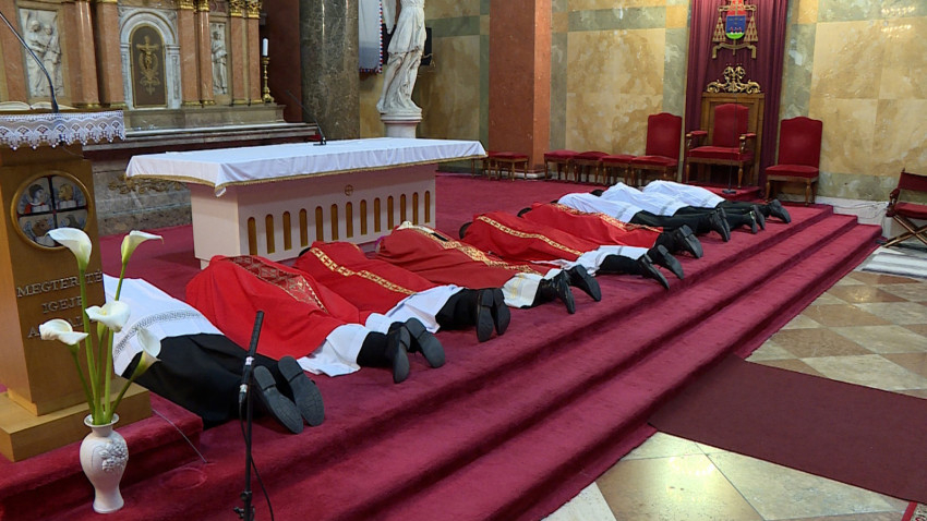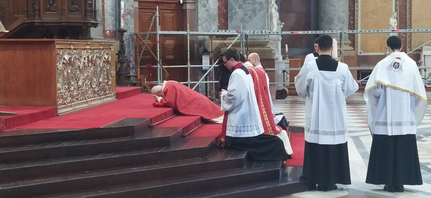 Ternyák Csaba egri érsek és az asszisztencia a vértanúk piros ruhájában vonult az oltár elé az egri bazilikában, és a földre borulva imádkoztak, kifejezve az Isten szeretete iránti alázatot.