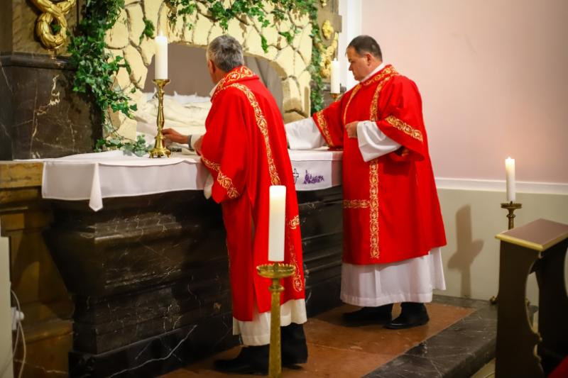 A főpásztor magára vette Krisztus halott testét ábrázoló síri leplet, a plascsenyicát, körmenetre indult a papokkal, asszisztenciával és a hívekkel, majd a templom bejáratában megállva Papp Tibor főhelynök atyával együtt tartották a leplet, s mindenki, aki a templomba újra belépett, meghajolt Krisztus előtt (síri leple alatt).