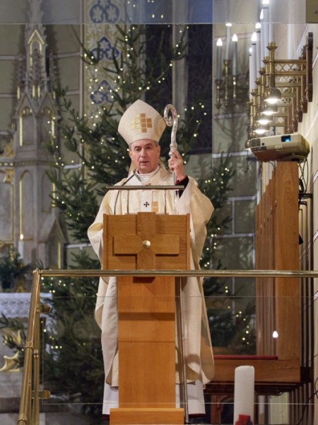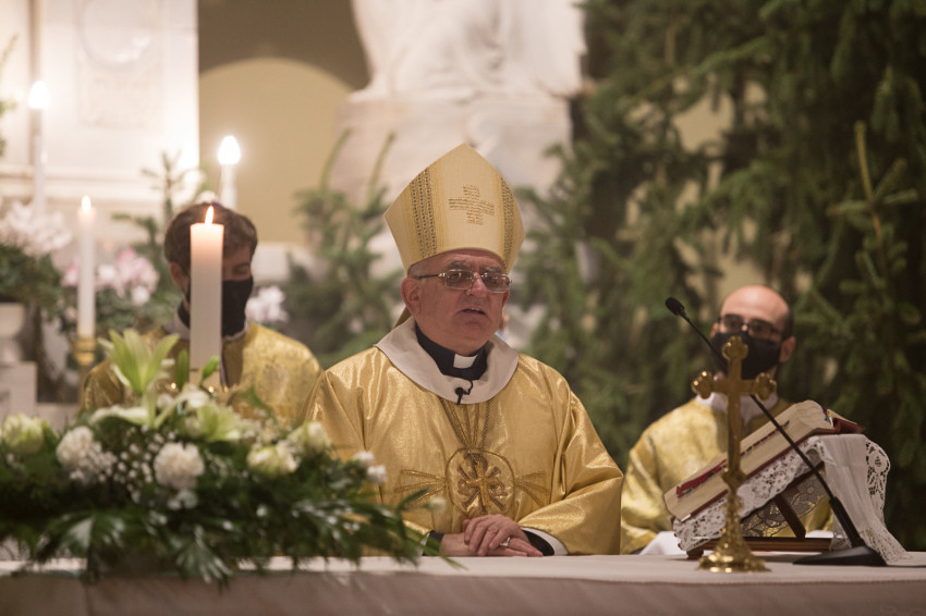 E rendkívüli időben az éjféli mise helyett kora este bemutatott szentmise kezdetén a főpásztor köszöntötte a jelenlevők mellett a közvetítéseken keresztül bekapcsolódókat, külön kiemelve a betegeket, a magányosokat, a talán idén szokatlan módon ünneplő családokat, valamint imáiról biztosította az egészségügyben dolgozókat, az ebben a nehéz időkben is helytálló orvosokat és ápolókat.