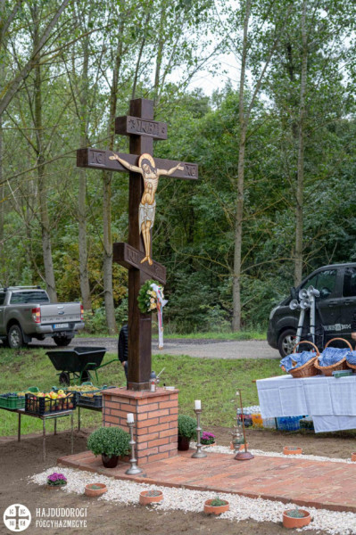 Sok időt és előkészületet igényelt a feszület elkészítése: miután a Nyírerdő Zrt. engedélyét is megszerezték, a kereszt helyét kiásták, betonoztak, alapoztak, burkoltak… igazi férfimunka volt. A burkolás különlegessége, hogy a téglákat a debreceni Attila téri főszékesegyház felújításáról hozták, a körülbelül százéves tégladarabok most a Hajdúsámsonhoz tartozó Martinkán folytatják útjukat Isten dicsőségére. Az édesapák önerőből, a kétkezi feladatokban egymást segítve haladtak előre céljuk megvalósításában. Az eredmény pedig magáért beszél…