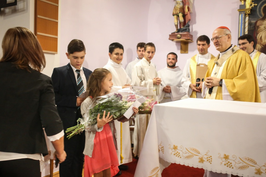 A szentmise elején a hívek és az egyháztanács nevében köszöntötték a bíboros főpásztort, illetve a plébánia fiataljait képviselő gyerekek átnyújtották Erdő Péternek a templom mézeskalácsból készült makettjét.
