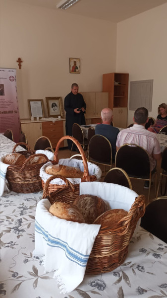 A frissen sült, illatozó kenyerekkel megrakott nagy kosarakat és a maradék kovászból készült krékereket tartalmazó kiskosarakat felvittük a templomba, ahol a Szent Liturgia végeztével Mihály atya megszentelte őket.