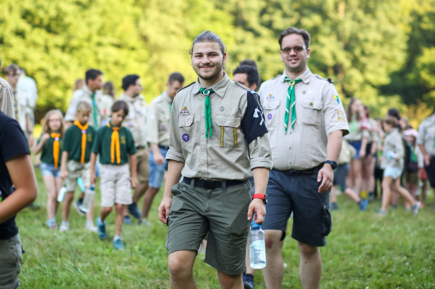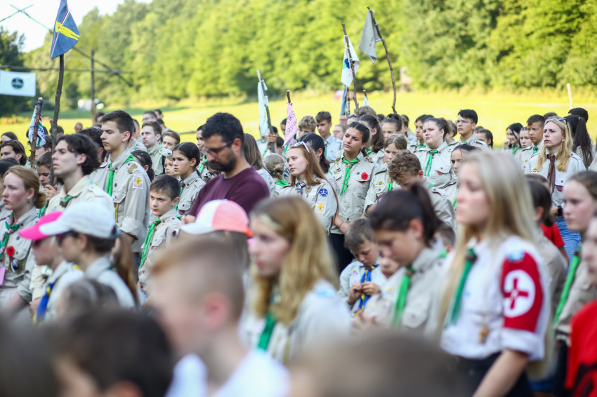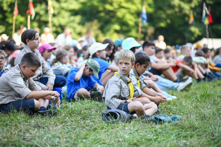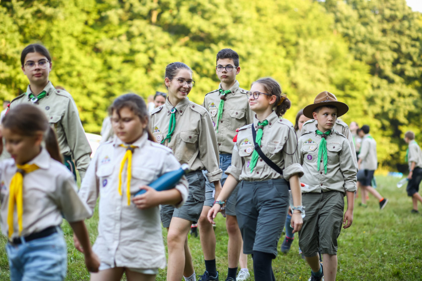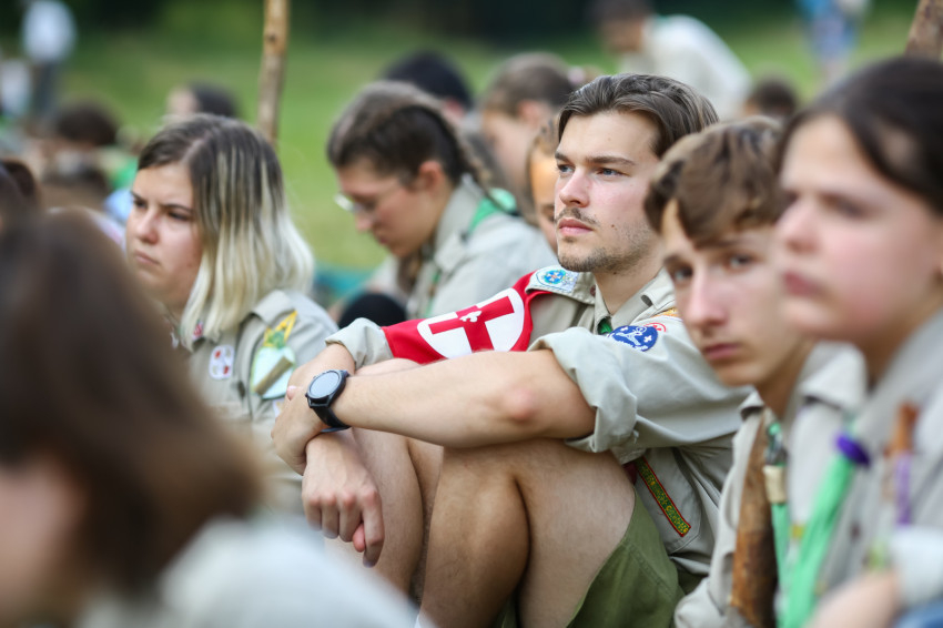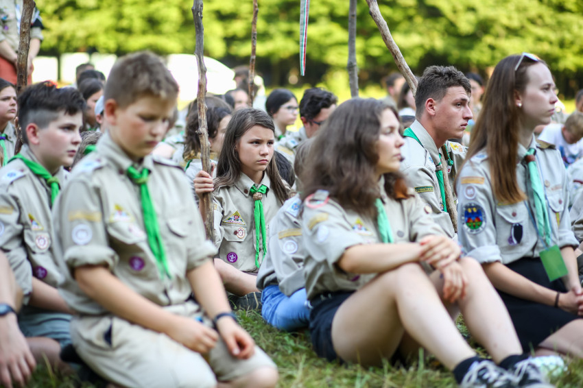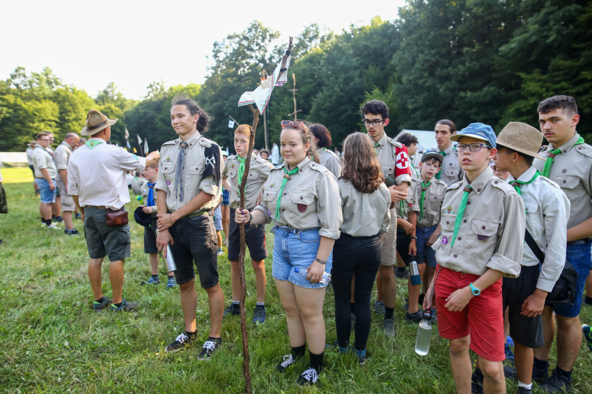 Varga Bálint táborparancsnok a nyitónapról beszélt. Nagy ünnep volt. 43 cserkészjelölt a nagytábor előtt tehetett fogadalmat. „Még egy hét van előttünk, a találkozás, együttlét megannyi élménye.”