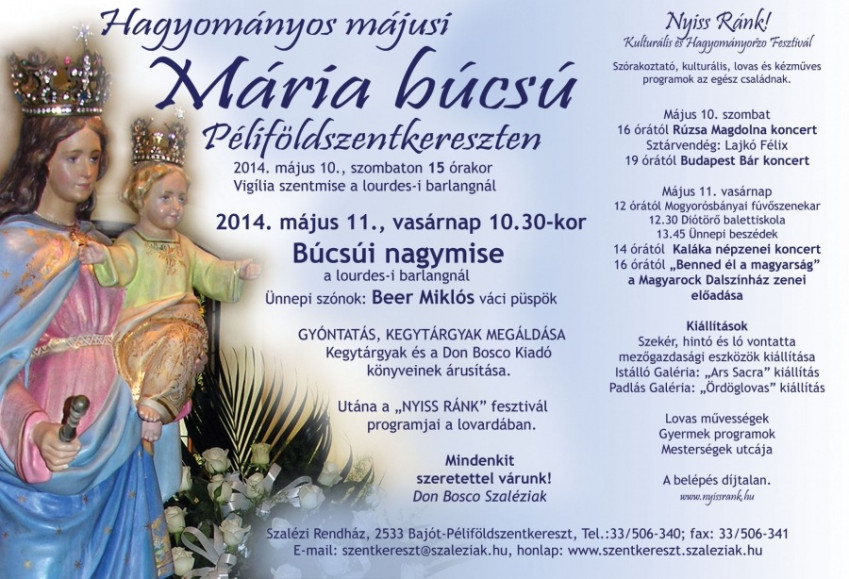 A kegytemplom felújítása miatt minden szertartást szabadtéren, a lourdes-i barlangnál tartanak: május 10-én, a búcsú vigíliáján délután 15 órakor itt mutat be szentmisét Havasi József korábbi tartományfőnök.