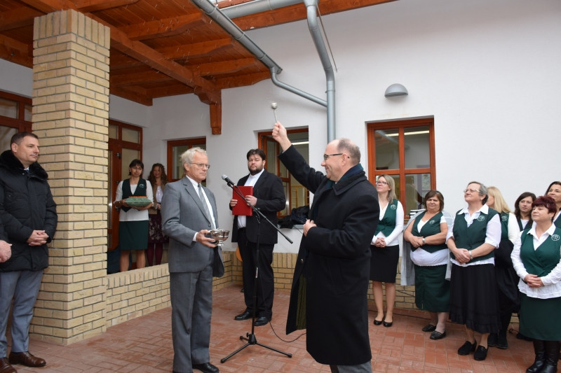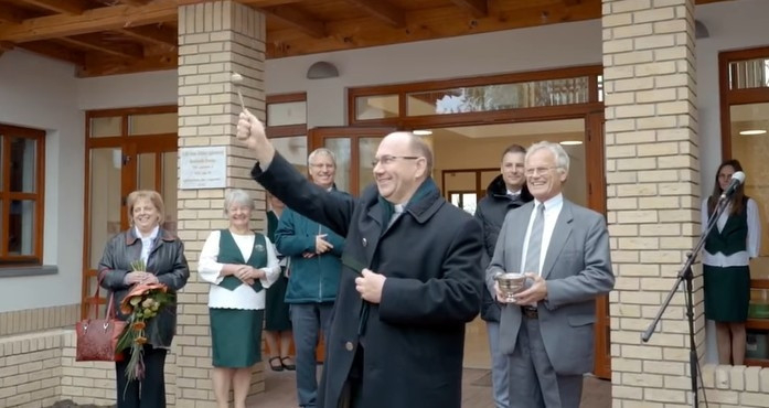 Az ünnepség az új épület főbejáratánál folytatódott, ahol Marton Zsolt váci megyéspüspök beszélt a gyermeki ártatlanságról és a szeretetteljes függőségről, amely Istent és embert, szülőt és gyermeket kapcsol össze. Hangsúlyozta, az óvoda az első olyan közeg, ahol a gyerekek először találkoznak a társadalommal, családon kívüli közösséggel, amely formálja és felkészíti őket az életre. Beszéde után megáldotta az épületet, majd hivatalosan megnyitották az óvoda kapuit a látogatók előtt.