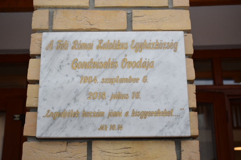 A november 8-i átadóünnepség a fóti katolikus templomban kezdődött. Elsőként Csáki Tibor, a váci Egyházmegyei Katolikus Iskolák Főigazgatóságának (EKIF) főigazgatója mondott beszédet, melyben valódi értéknek és életindításhoz méltó helynek nevezte a katolikus óvodákat. Ezt követően Soltész Miklós, a Miniszterelnökség egyházi és nemzetiségi kapcsolatokért felelős államtitkára szólt a jelenlévőkhöz a szülőket, a pedagógusokat és az egyházat hármas egységnek nevezve, amelyben a nevelésről közösen kell gondolkodni. Ez az összefogás nagy segítséget és erőt tud adni ahhoz, hogy a gyermekekből kiegyensúlyozott és boldog felnőtt válhasson.