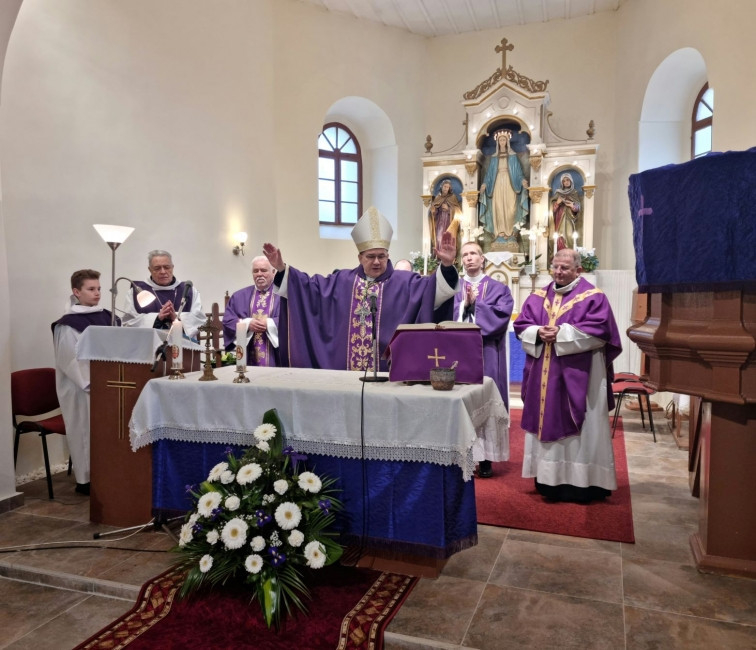 „Istennek ajánljuk ezt a megújított templomot, arra kérve őt, hogy legyen segítségünkre kegyelmével. A szenteltvíz tisztítsa meg ezeket a falakat, mi vagyunk az élő Egyház, akik hitben és szeretetben itt egybegyűltünk” – mondta a püspök, majd megszentelte az épületet belül és kívül is.