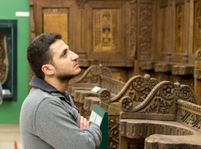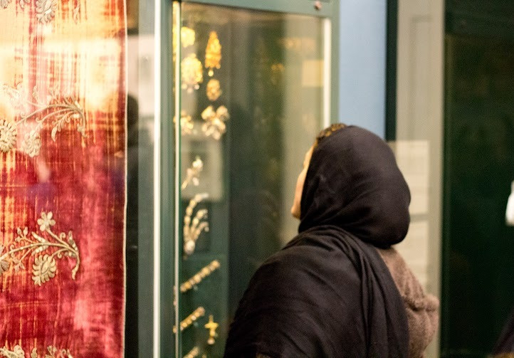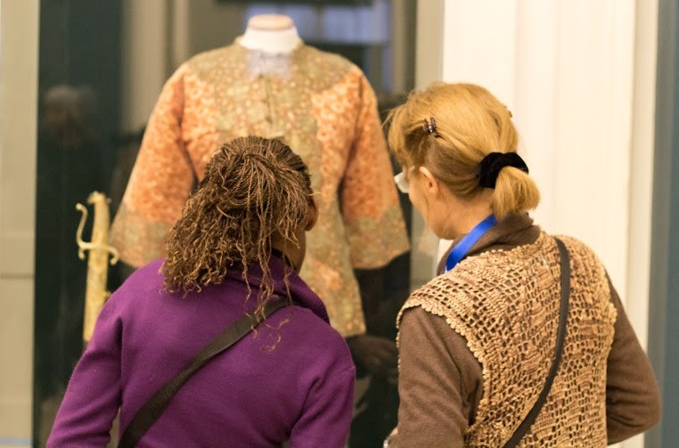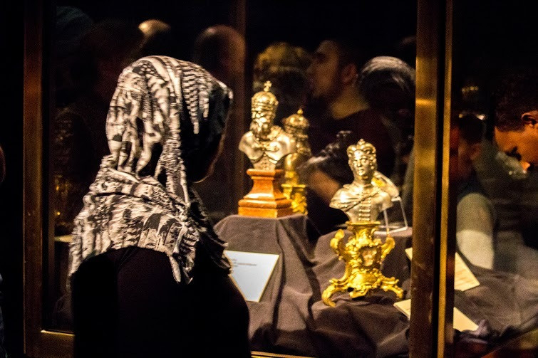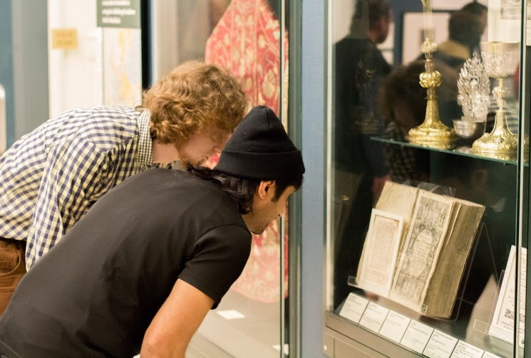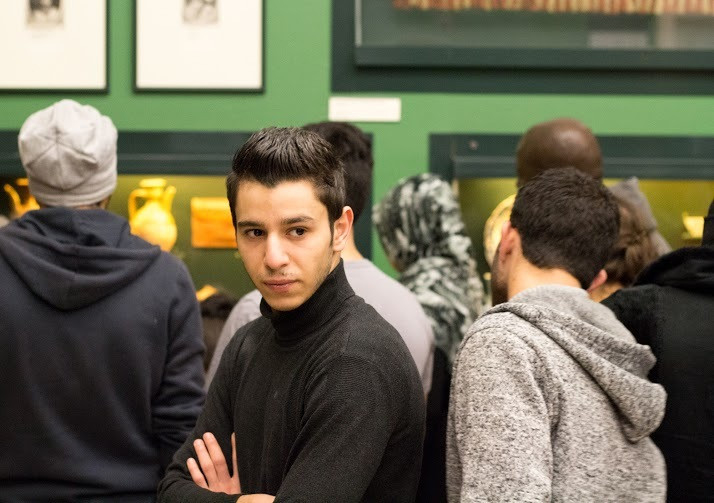 A Szíriából és Irakból érkezett menekültek egy kisebb csoportja különösen nagy érdeklődéssel követte a tárlatvezetést, az arab feliratoknál elmélyülten próbálták megfejteni a korabeli szövegek jelentését.