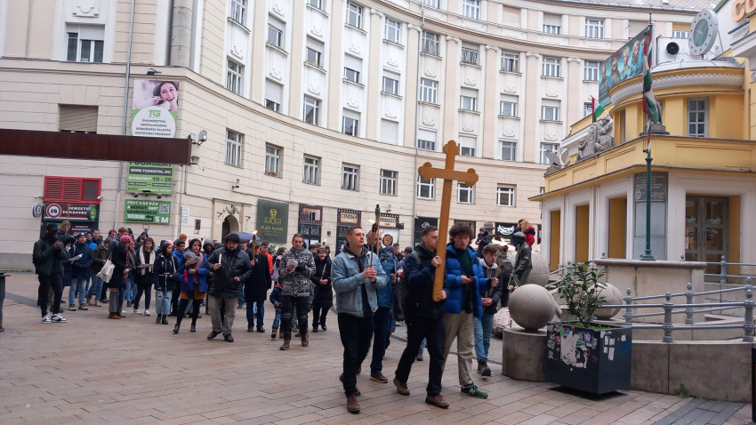 Az Óperint utcai hídtól indult a keresztút, végállomása ezúttal is a Szent István-szobor volt. Az egyes stációk között különböző plébániák, egyházmegyei és egyházi szervezetek képviselői, kispapok vitték a keresztet és közben felidézték Krisztus szenvedését, megfogadva: méltóvá teszik életüket Őhozzá.