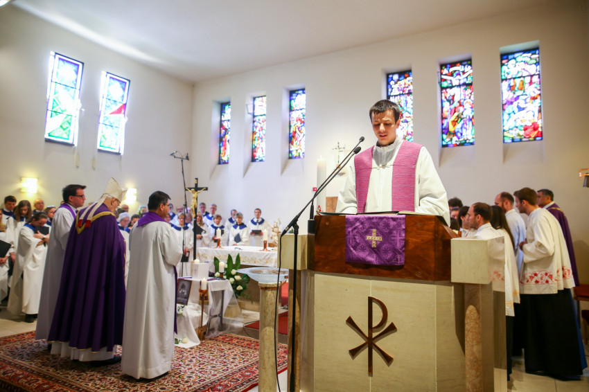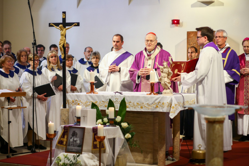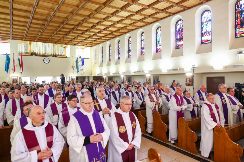 A harang szavára csendben vonult be az asszisztencia, valamint a püspökök az oltárhoz, mely előtt állt a templom plébánosának ravatala. Majd felhangzott a Requiem. „Adj, Uram, őnéki örök nyugodalmat, és az örökkévaló világosság fényeskedjék néki.”