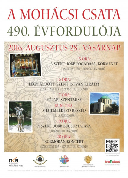 Idén 490 éve annak, hogy Mohácsnál az Oszmán Birodalom hada legyőzte a magyar sereget. Az 1526-os ütközetről, Magyarország történelmének egyik legmeghatározóbb eseményéről augusztus végén Mohácson háromnapos rendezvény keretében emlékeznek meg. A Magyar Katolikus Egyház, a Pécsi Egyházmegye Mohácsi Római Katolikus Plébániája, Mohács Város Önkormányzata, valamint a Duna-Dráva Nemzeti Park Igazgatósága közösen szervezi azt a programsorozatot, amelynek alkalmából augusztus 28-án, vasárnap Mohácsra érkezik a Szent Jobb.