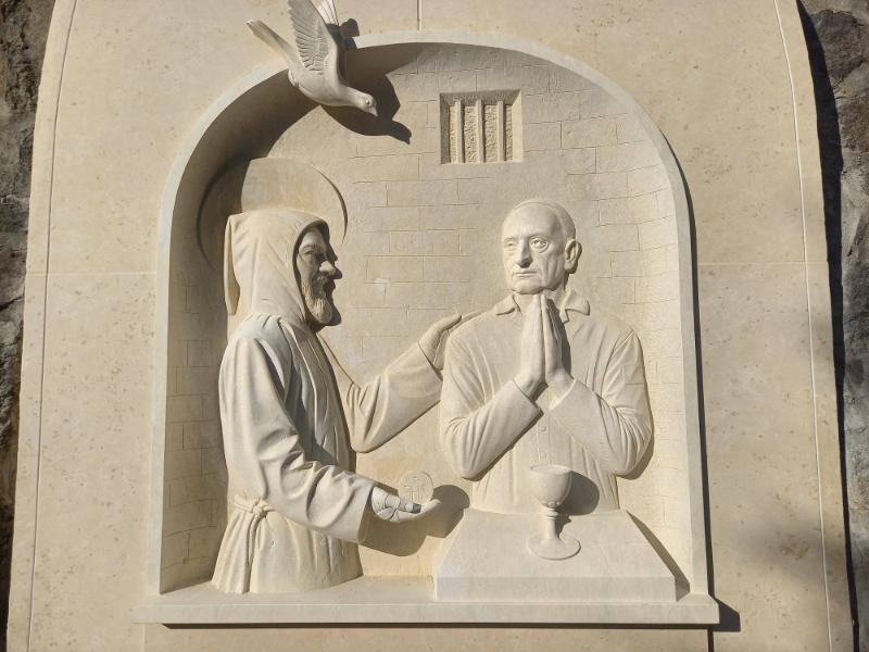 Az alkotás egy misztikus jelenetet örökít meg: Pio atya bilokációját és közös szentmiséjét a börtönben lévő Mindszenty József bíborossal.