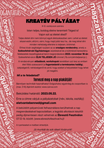 A plakátkészítő pályázat keretében 8–12. osztályos fiatalok munkáit várják. Nevezni lehet egyénileg és kiscsoportban (maximum 3 fő) is.