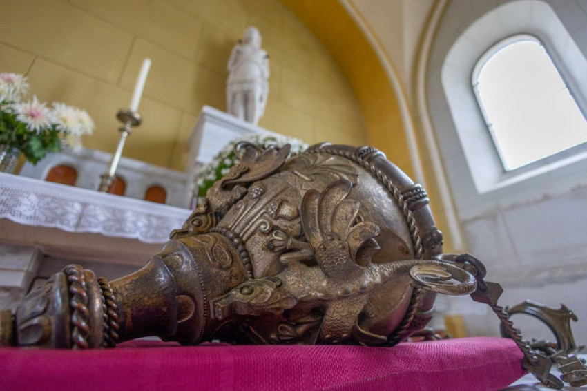 A főoltár Jézus megkeresztelkedését, a három mellékoltár Jézus Szívét, Máriát és Szent Sebestyént ábrázolja. Szent Sebestyén a község védőszentje, mivel az 1714-es pestisjárványtól az ő közbenjárására menekült meg a falu népe. (Forrás: miserend.hu)