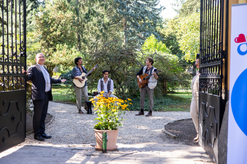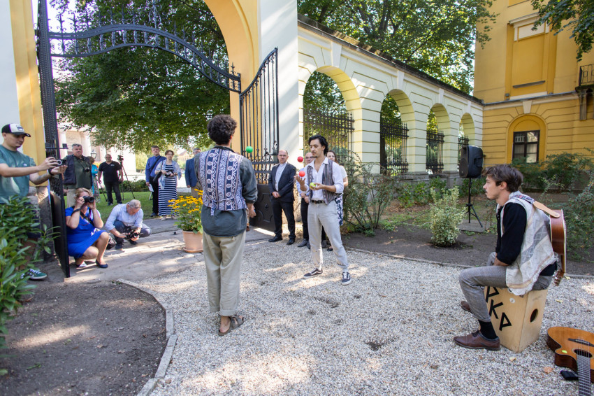 A tájékoztató végén ünnepélyesen kinyitották a püspöki palota felújított 18. századi kovácsoltvas kerti nagykapuját, ami az Egyház minden jó szándékú ember felé megnyilvánuló szeretetét is szimbolizálja; majd a Héba Karaván zenei és zsonglőrprodukciója adott ízelítőt a fesztiválhangulatból.