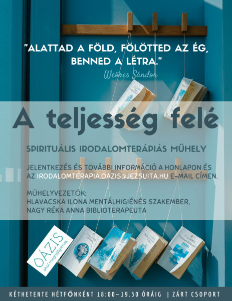 „Belső útkeresésünkben, lelki növekedésünkben segíthet az irodalom gyógyító erejének megtapasztalása” – vallja a budapesti Oázis Lelkigondozó és Mentálhigiénés Szolgálat, amely Alattad a föld, fölötted az ég, benned a létra – A teljesség felé címmel spirituális irodalomterápiás műhelyt indított szeptemberben. A csoport zárt, térítésmentes, további alkalmaira még a hét végéig lehet jelentkezni az irodalomterapia.oazis@jezsuita.hu e-mail-címen.