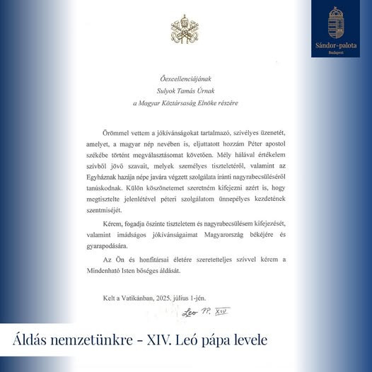 „Mélységes tisztelettel fogadtam XIV. Leó pápa jókívánságait és áldását. A Szentatya szavai – a hit, a béke és a szolgálat szellemében – lelki megerősítést és reményt jelentenek nemzetünk számára.