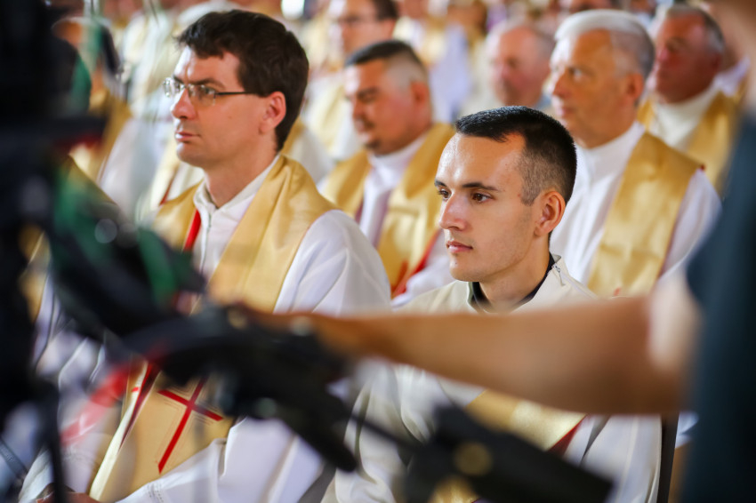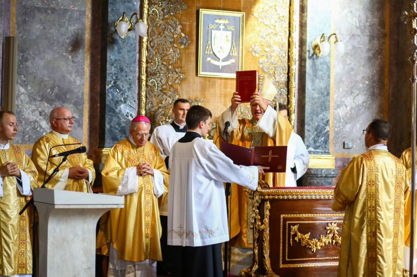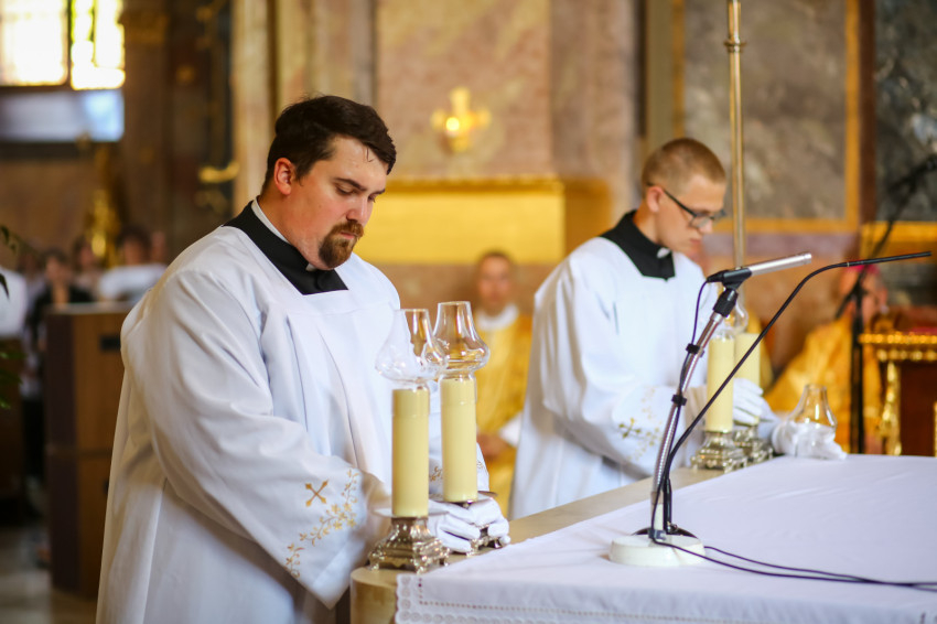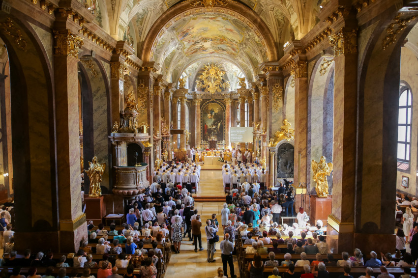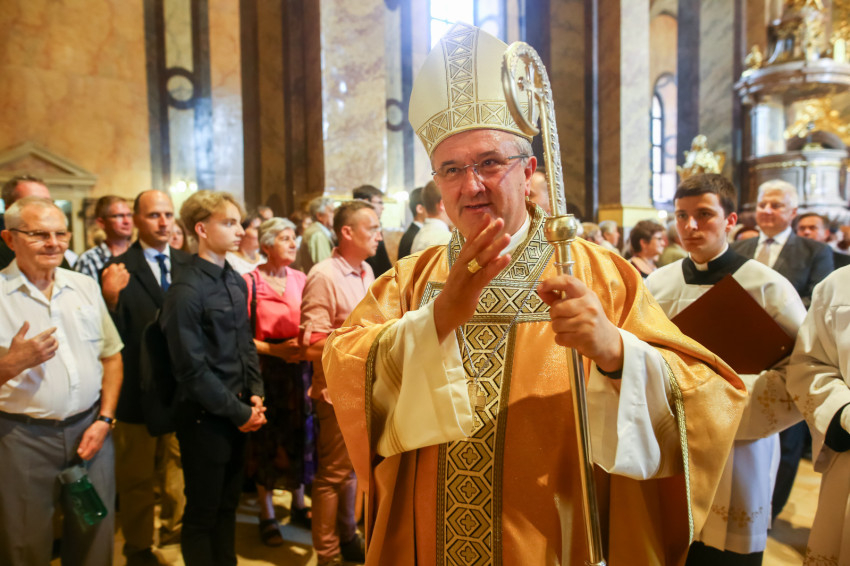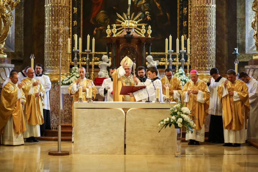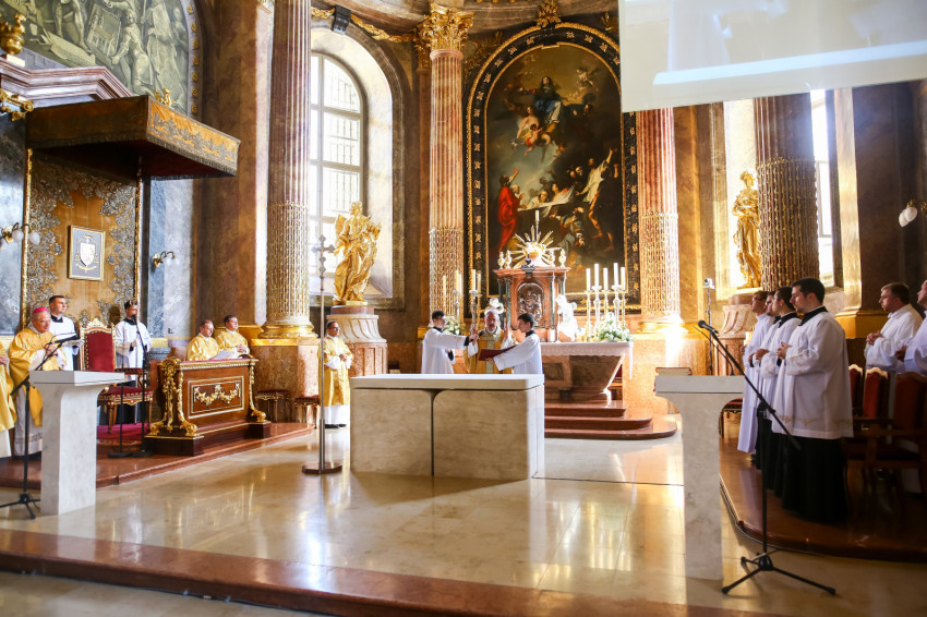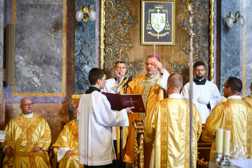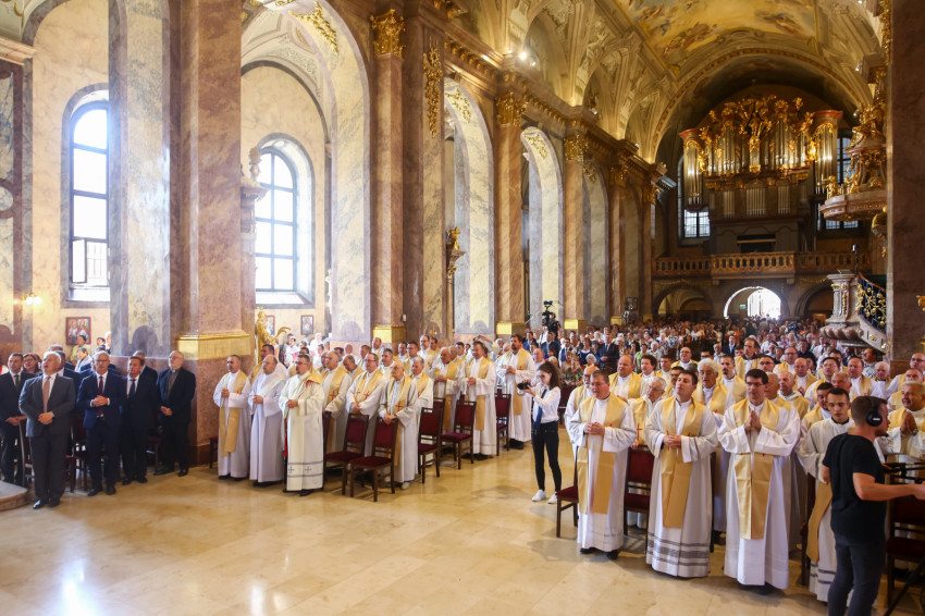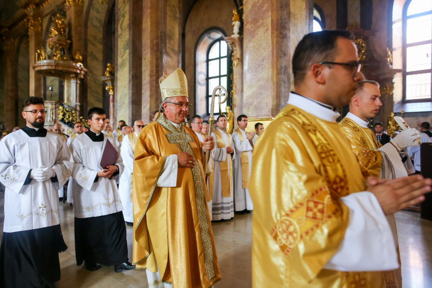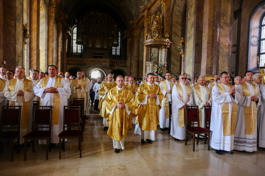 „Lépjünk be hálaadással, és énekelve magasztaljuk az Urat.” Megszólalt az orgona, és bevonult a kereszttel az élen az asszisztencia, köztük a papnövendékek, az egyházmegye papsága, a diakónus és a megyéspüspök.