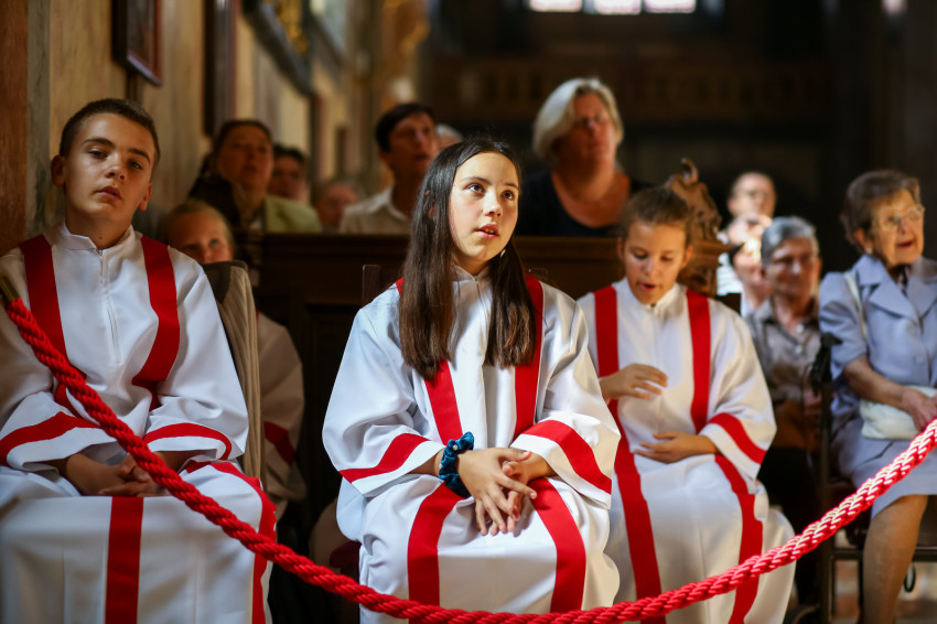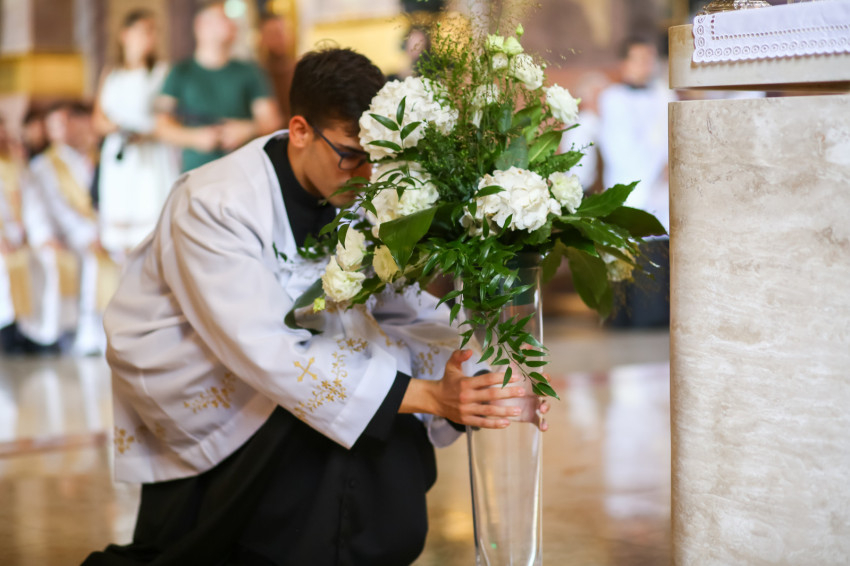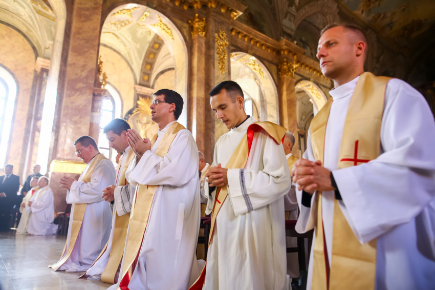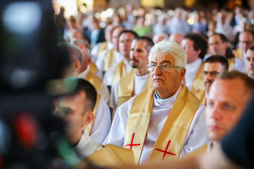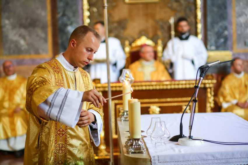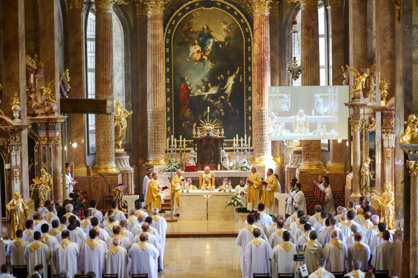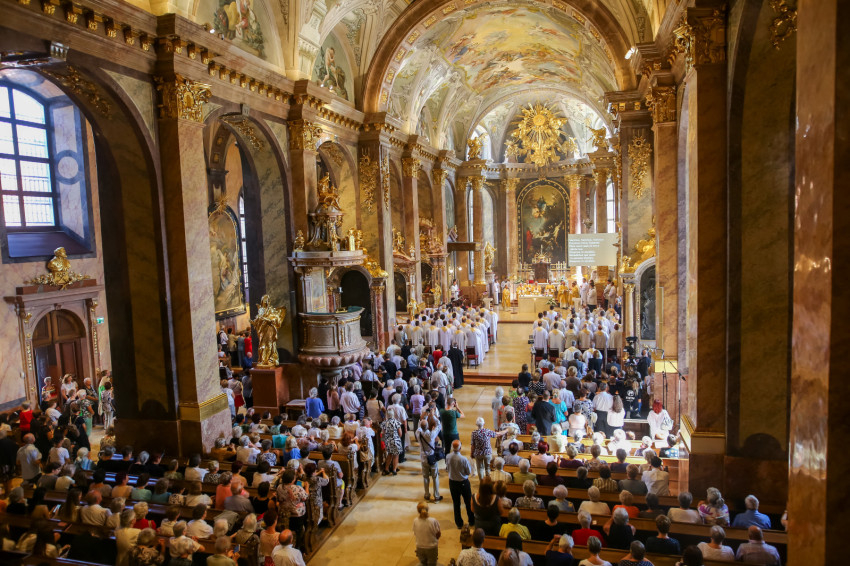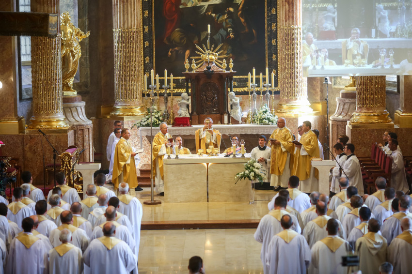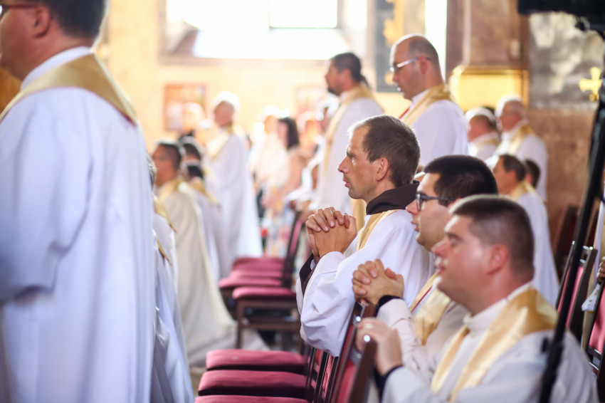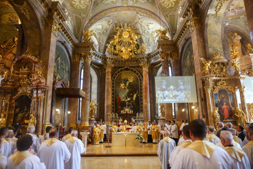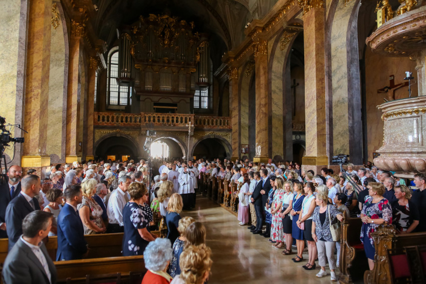 „Lépjünk be hálaadással, és énekelve magasztaljuk az Urat.” Megszólalt az orgona, és bevonult a kereszttel az élen az asszisztencia, köztük a papnövendékek, az egyházmegye papsága, a diakónus és a megyéspüspök.