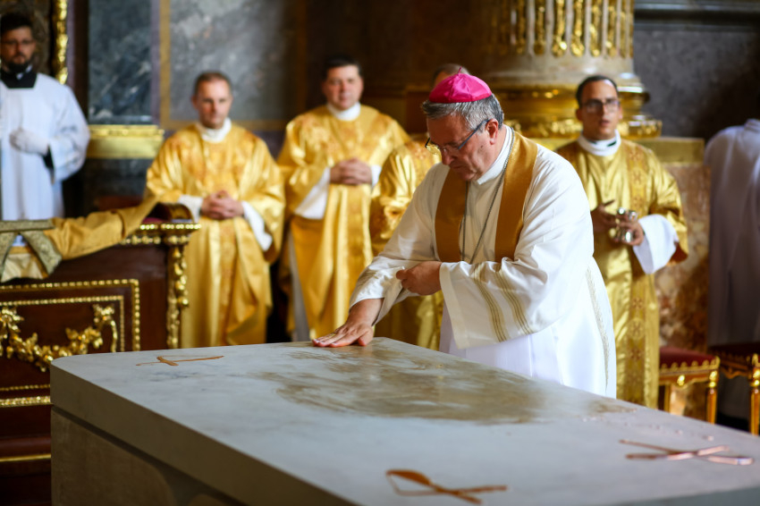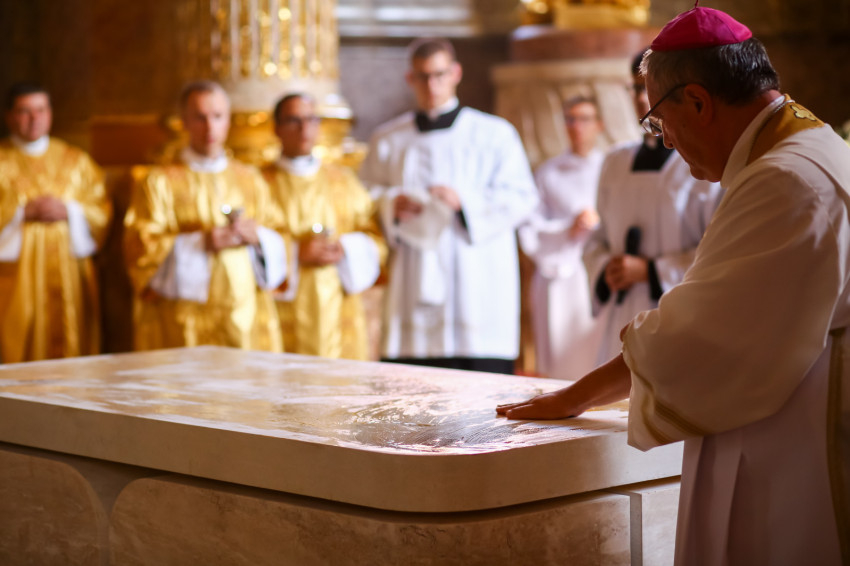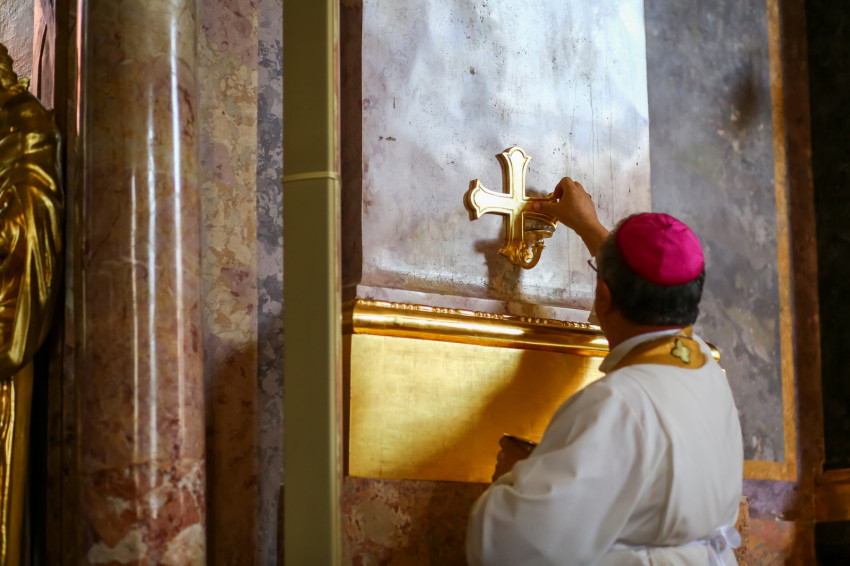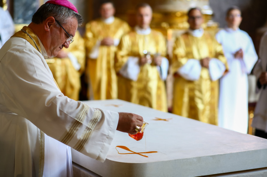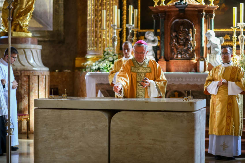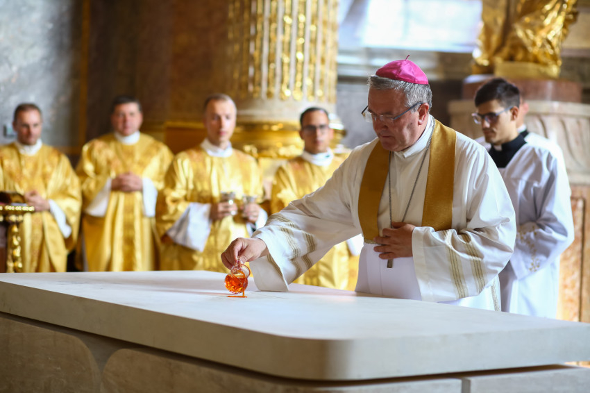 Ezt követően elhelyezték az oltárban az ereklyéket. A győri megyéspüspök az oltárnál állva mondta el a felszentelő imát, majd megkente olajjal az oltárt.