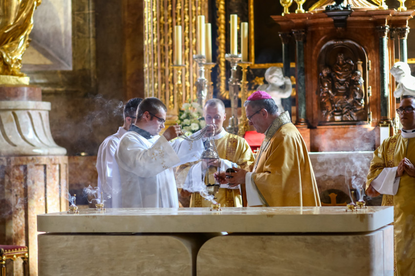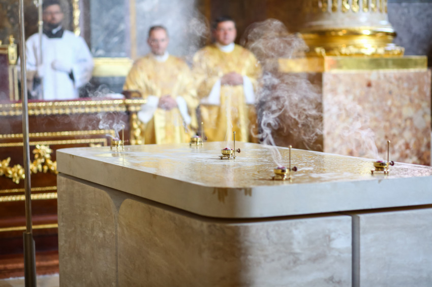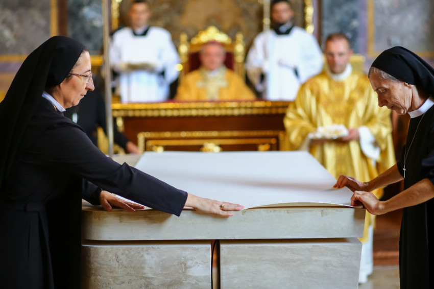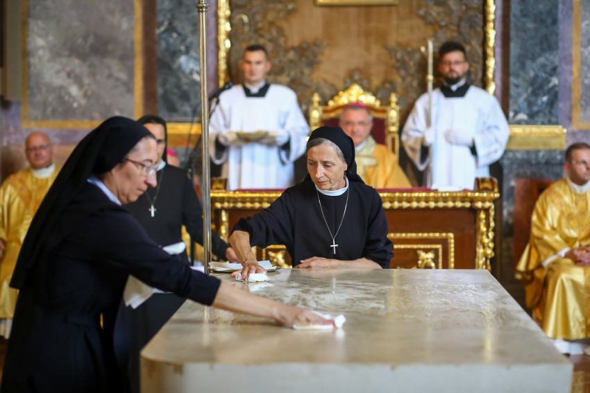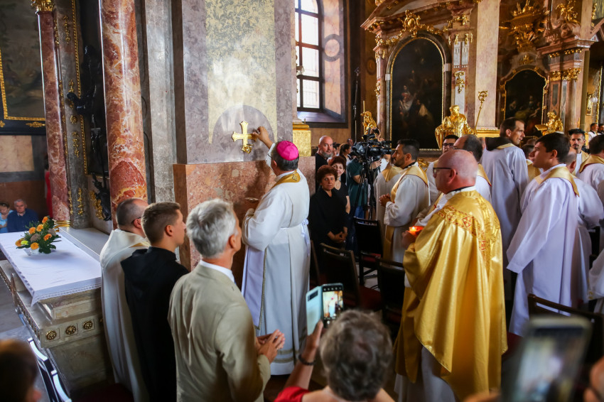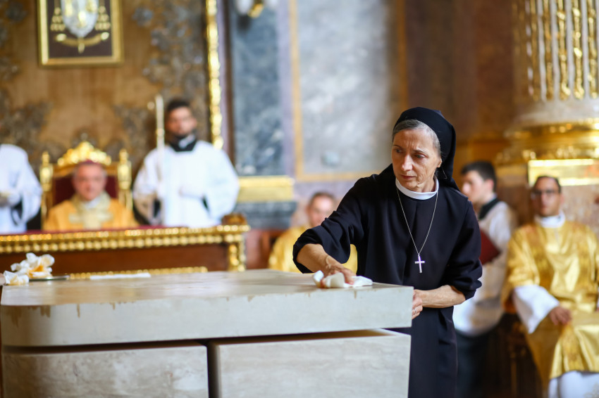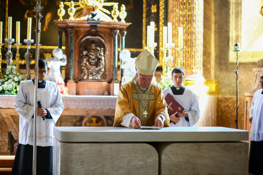 Ezt követően elhelyezték az oltárban az ereklyéket. A győri megyéspüspök az oltárnál állva mondta el a felszentelő imát, majd megkente olajjal az oltárt.