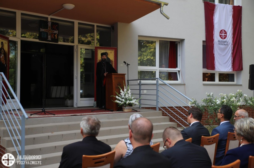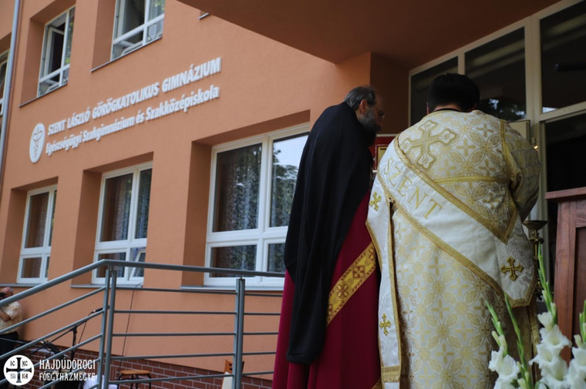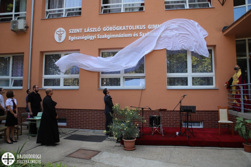 Az ünnepség elején Kocsis Fülöp hajdúdorogi érsek-metropolita megáldotta az iskola épületét, amely uniós és kormányzati forrásból, összesen 295 millió forintból újulhatott meg. A főpásztor Gulyás Gergely Miniszterelnökséget vezető miniszterrel és Papp Lászlóval, Debrecen polgármesterével együtt leplezte le az intézmény új nevének feliratát, mely már azt jelzi, hogy Szent László pártfogásába került az iskola.