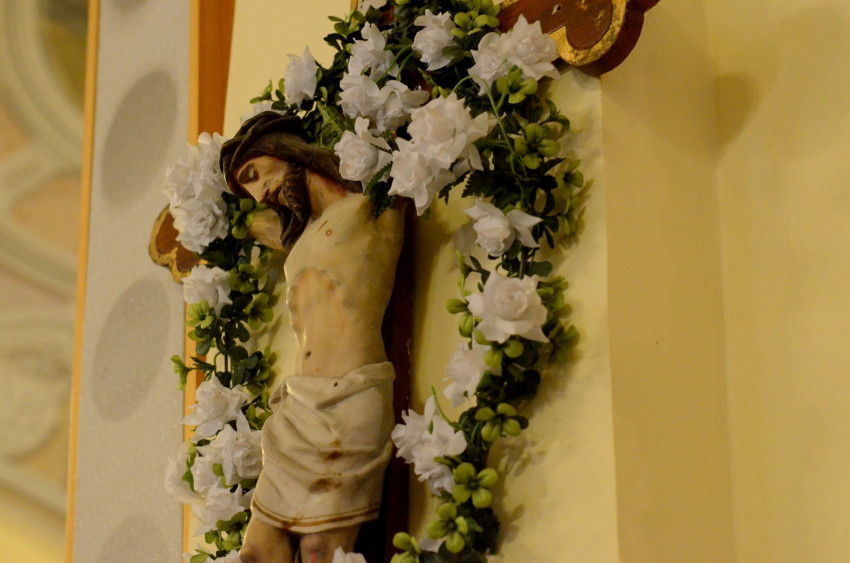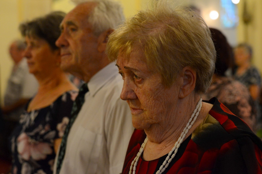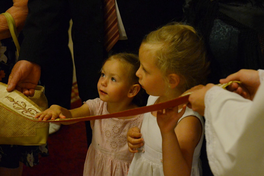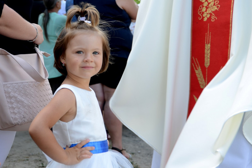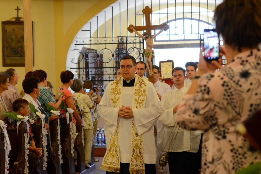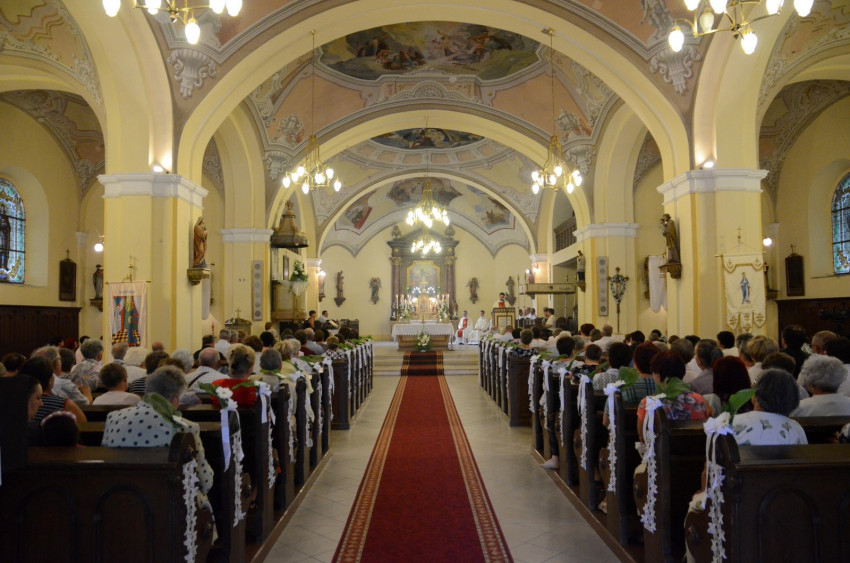 Fehér virágokkal díszített a templom, ünnepélyes a bevonulás. A falu mindehárom nyelve megszólal az újmisében.