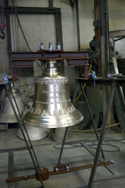 Mi közben félig és teljesen kész, homokfújt és lecsiszolt, már fényes harangokat nézegetünk, meg a felirataikat böngészgetjük. „Őseink emlékére öntette Lajoskomárom népe 2018-ban”, áll az egyiken.
