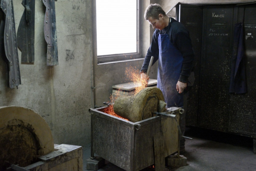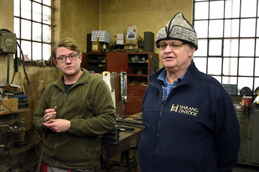 Erősen figyelünk, rettenetesen koncentrálunk, de hamar belátjuk, hogy itt és most biztosan nem válik belőlünk profi harangöntő, annyi apró részletet kellene összeillesztenünk és egységben látnunk. Ennek ellenére igyekszünk mindent megjegyezni, alaposan megnézni, megérteni. Visszamegyünk a nagyobb műhelybe, és az ott dolgozó Zsoltit kérdezgetjük – aki kisebb, ezért fektetve szárított magharangok alá töltögeti a parázst –, majd beóvatlankodunk a szomszédos lakatosműhelybe, amelyben Miklós fia, Ferenc az úr.